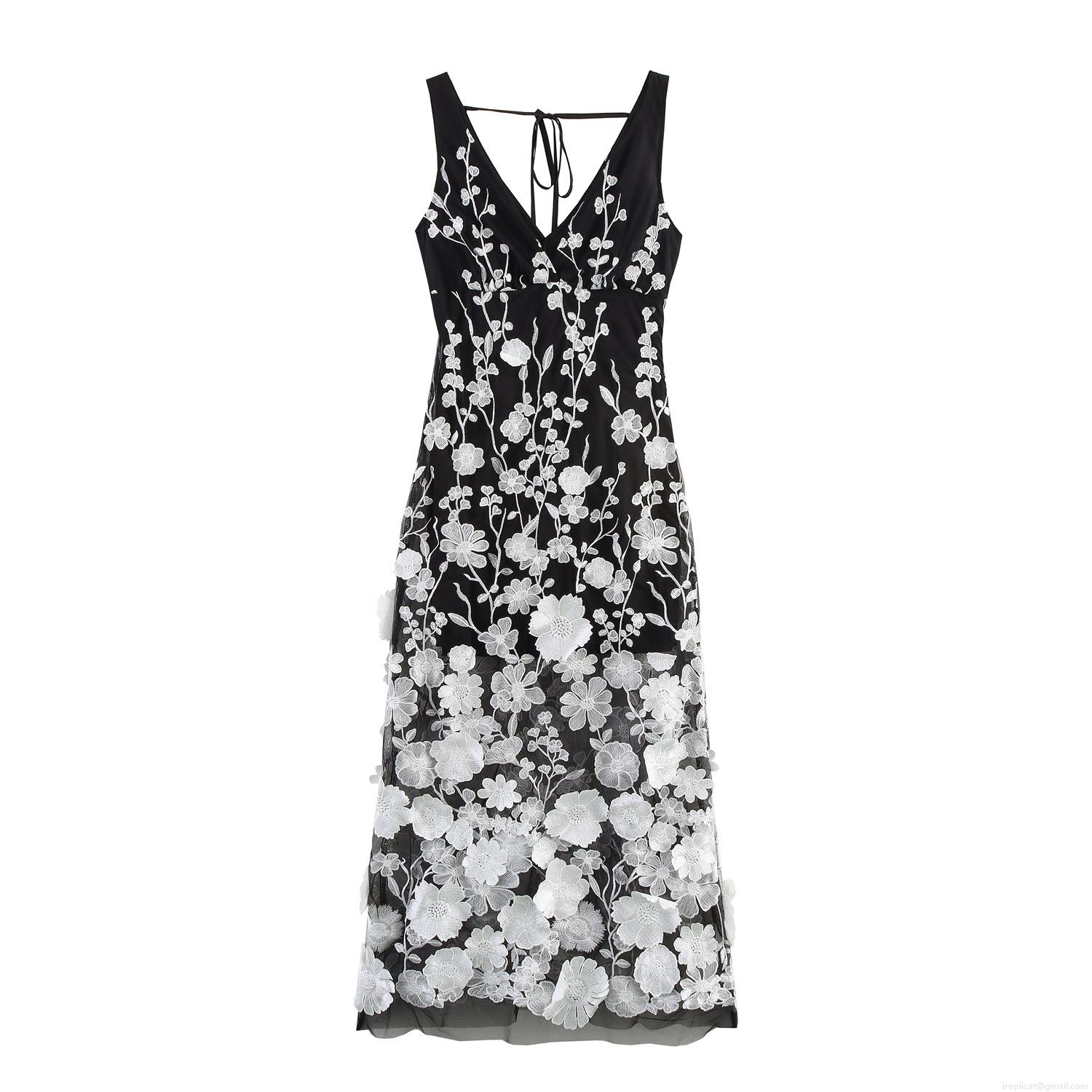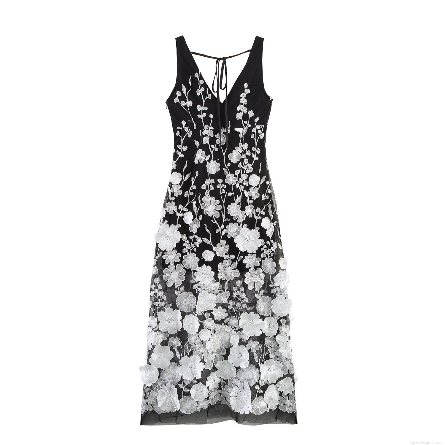 • Women Sexy 3D Floral Embroidery V Neck Maxi Dress Backless Tie Back Mesh Tulle Long Dress For Party Wedding Evening Club Elegant Sleeveless Gown
