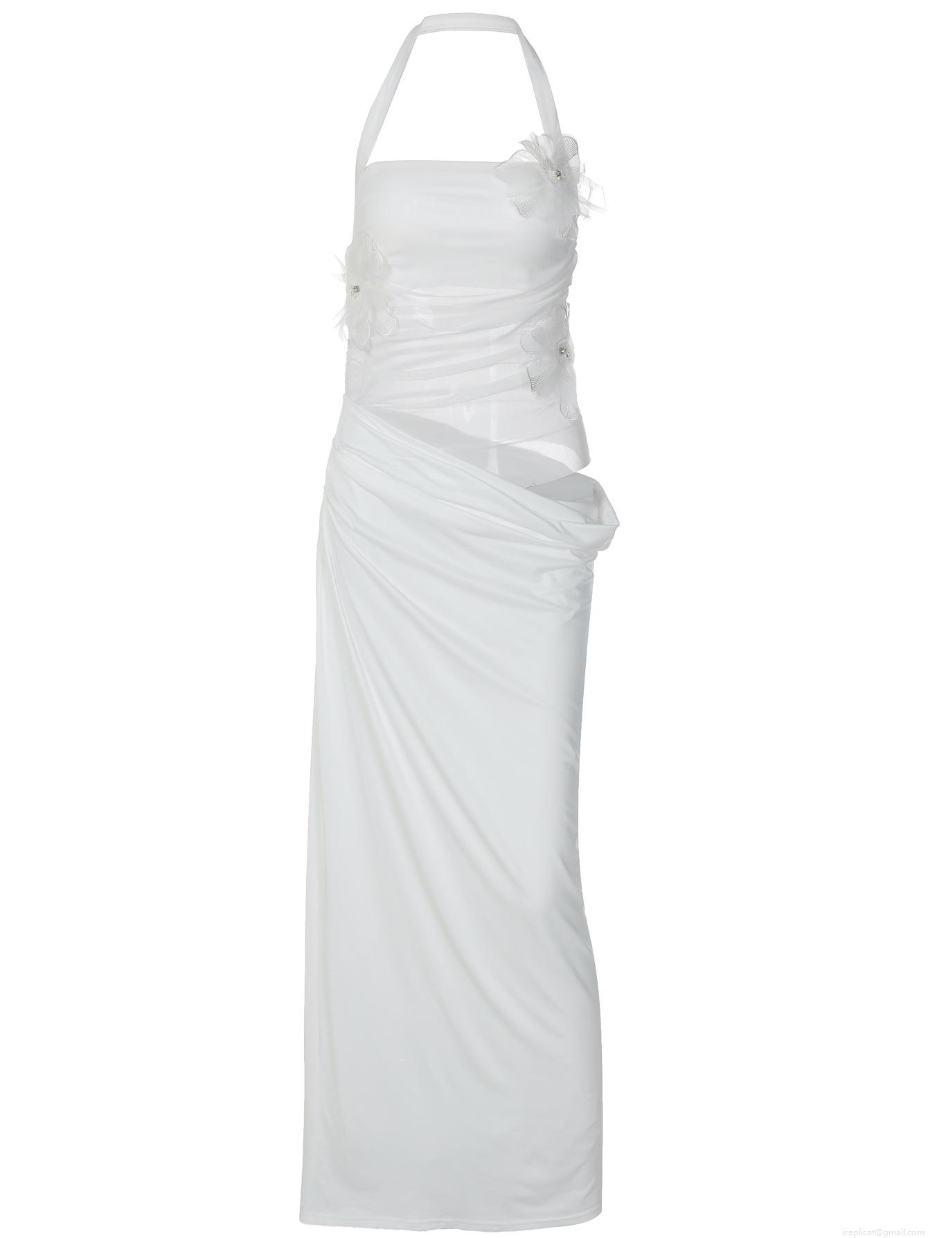 • Women Sexy 3D Flower Halter Dress Mesh Patchwork Pleated Maxi Dress Elegant Bodycon Party Clubwear Summer Sleeveless Long Dress