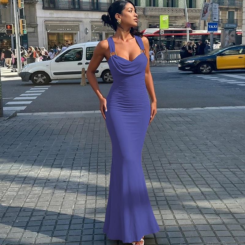 • Women Sexy Backless Cowl Neck Maxi Dress With Metal Ring Straps Ruched Floor Length Slim Fit Polyester Spandex Evening Party Dress