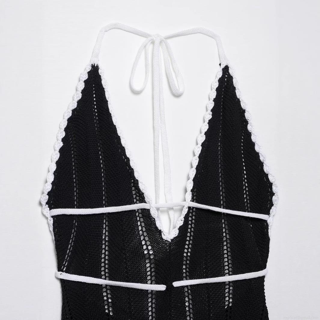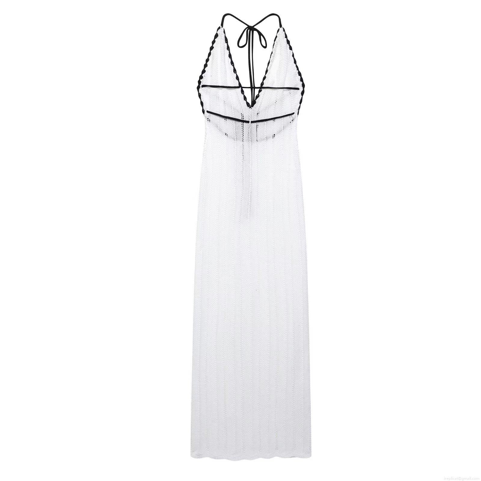 • Women Sexy Backless Crochet Knit Maxi Dress Deep V Neck Halter Contrast Color Bandage Long Dress For Summer Party Beach Vacation Elegant Lady Clothing