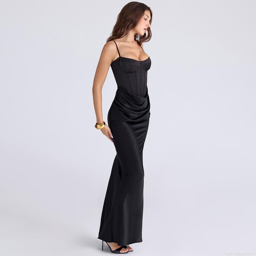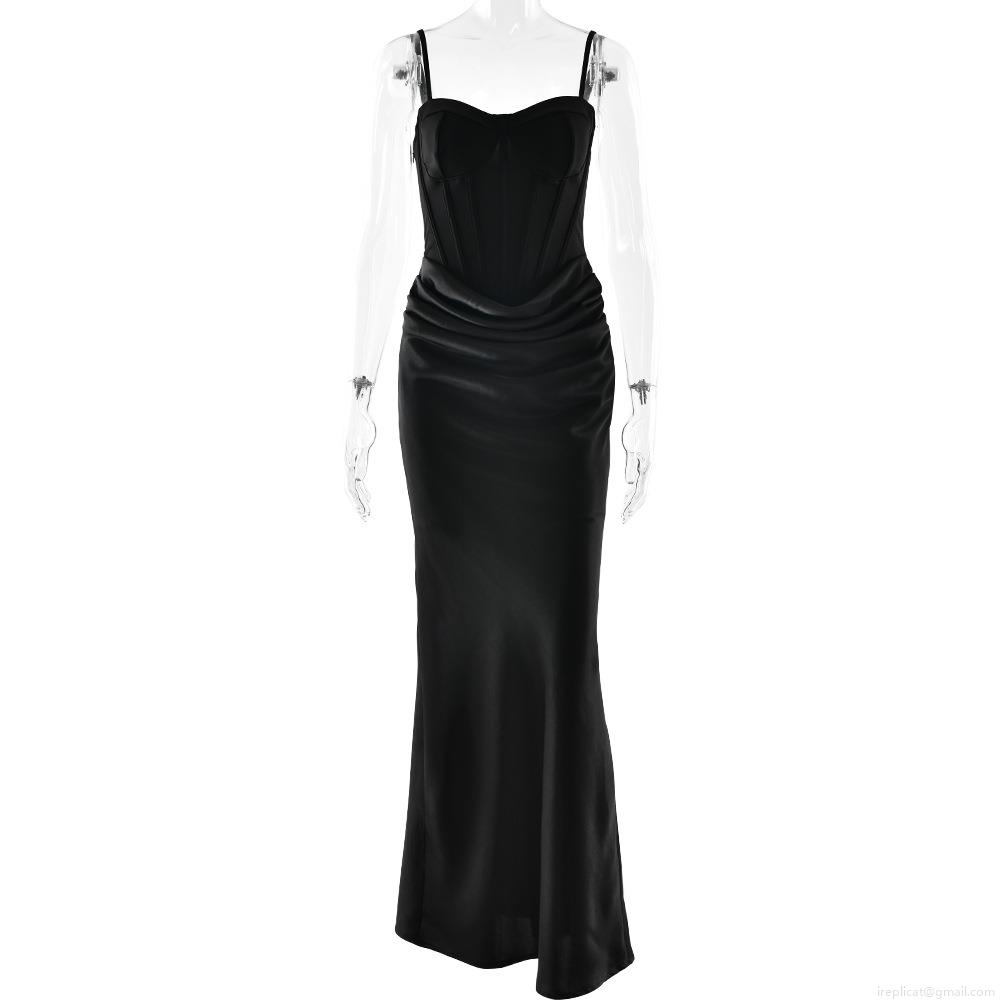 • Women Sexy Backless Fishtail Maxi Dress Spaghetti Strap Fishbone Corset Bodycon Evening Party Gown Solid Black Satin Patchwork Long Dress For Club Night Event