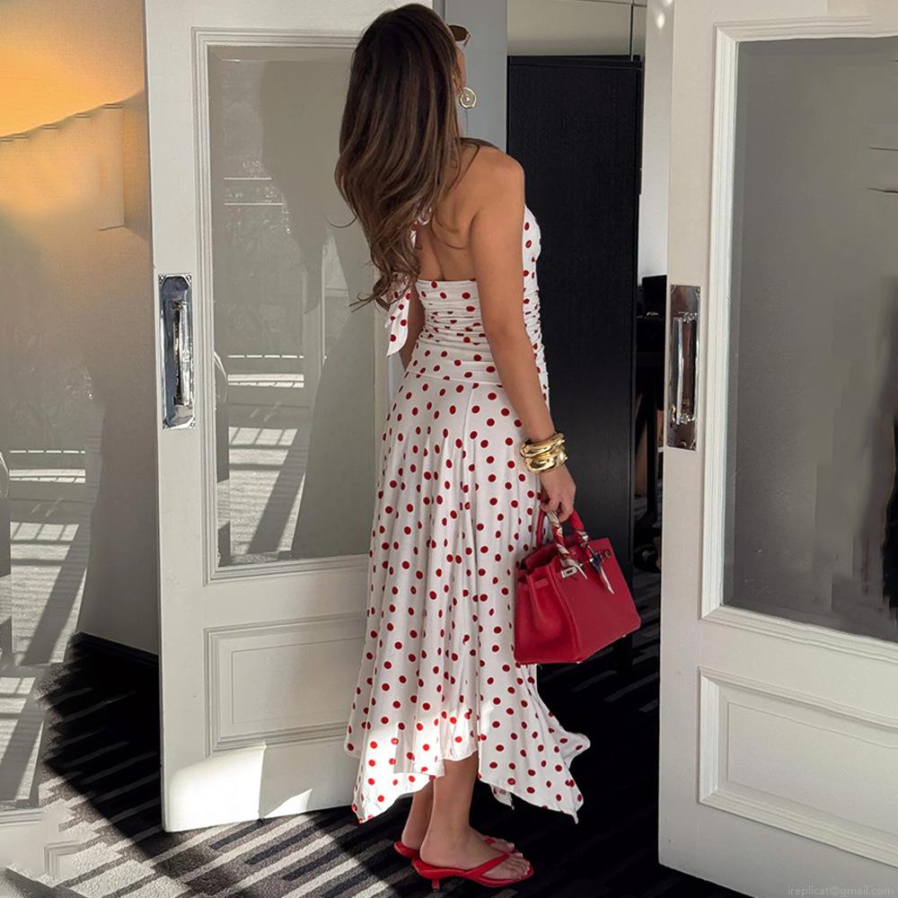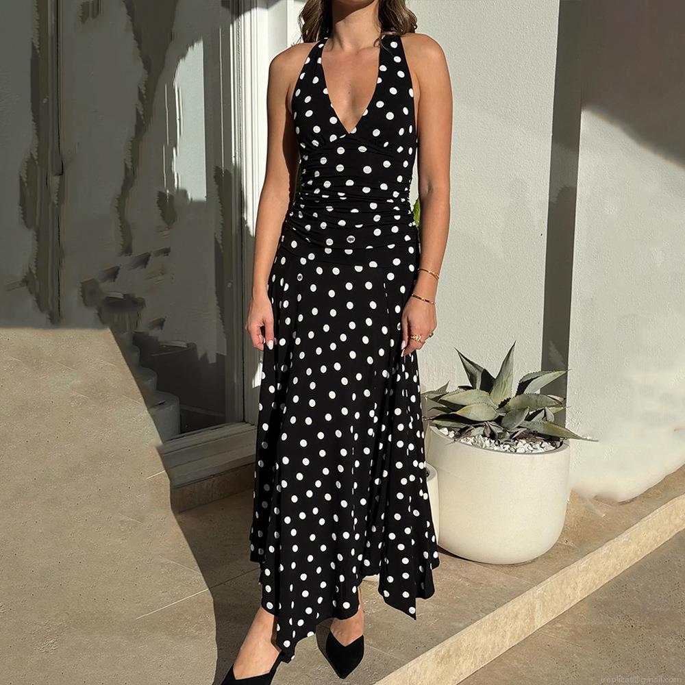 • Women Sexy Backless Halter Maxi Dress Polka Dot Print V-Neck Pleated A-Line Long Dress For Summer Vacation Party Milk Silk Polyester