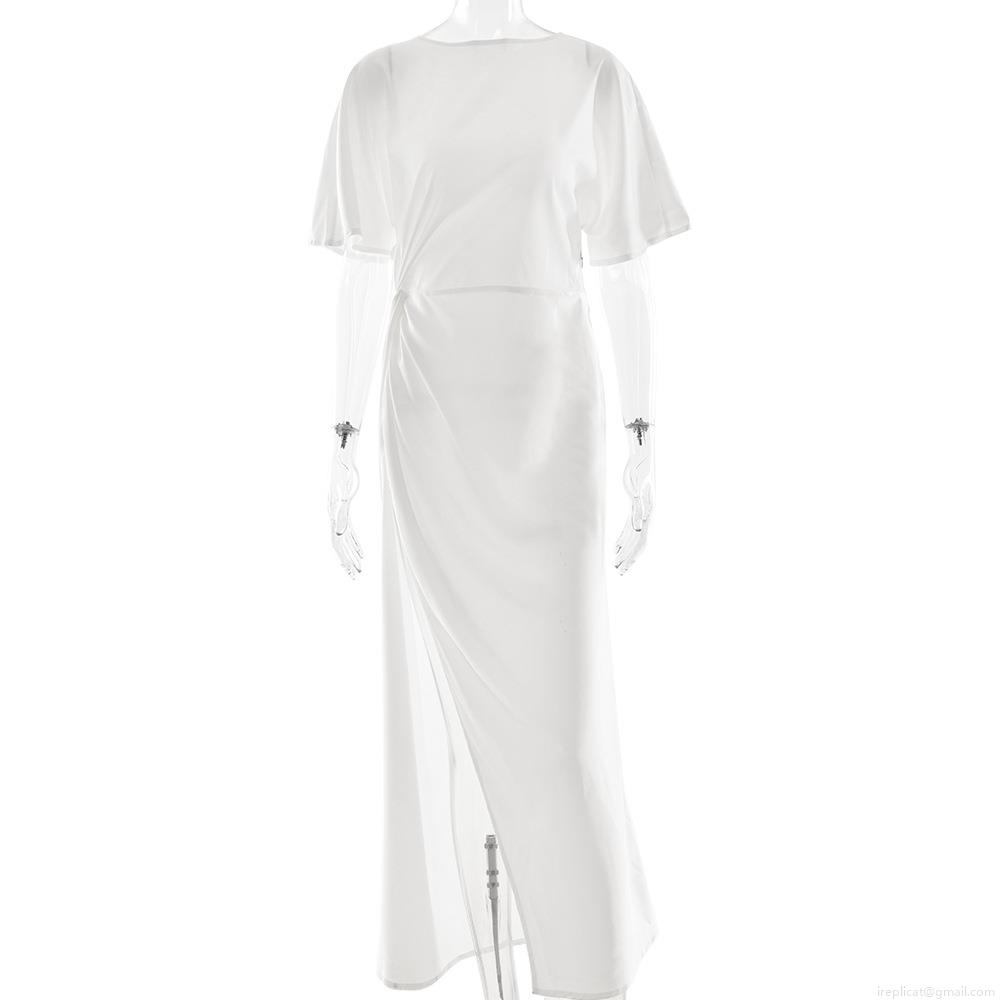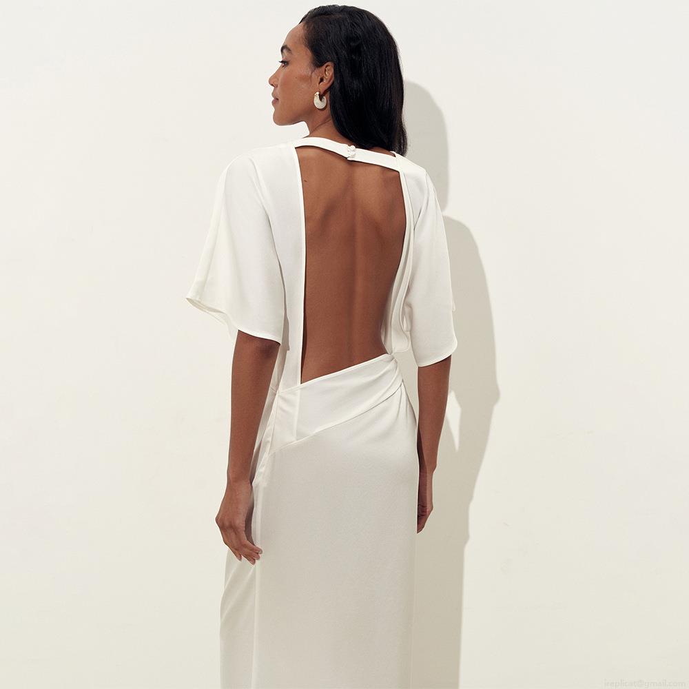• Women Sexy Backless High Slit Maxi Dress Elegant Satin Polyester Twist Front Short Sleeve Round Neck Solid Color Slim Fit Long Dress for Summer Party Vacation Night Out