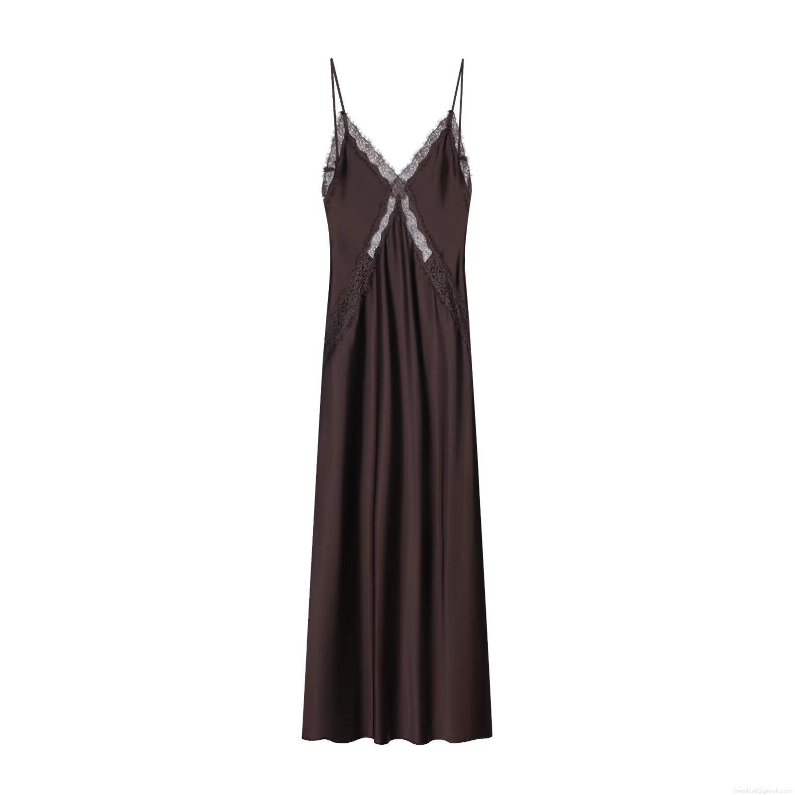 • Women Sexy Backless Lace Patchwork Slip Dress Satin Spaghetti Strap V Neck Maxi Dress For Party Clubwear Solid Color Evening Gown