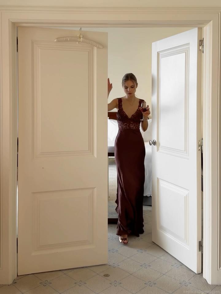 • Women Sexy Backless Lace Splicing Acetate Satin Maxi Dress V Neck Sleeveless Bodycon Camisole Long Dress Summer Niche Design Party Clubwear Slim Fit