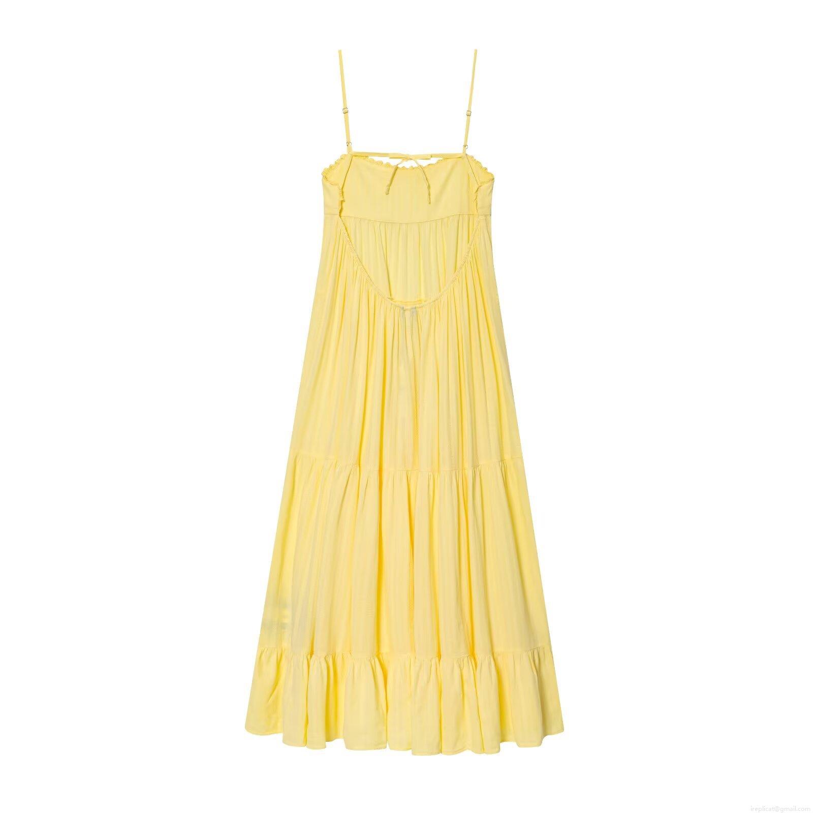 • Women Sexy Backless Lace-up Yellow Polyester Maxi Dress Sleeveless Tiered Cake Skirt Lace Trim Camisole Sundress For Summer Vacation Party