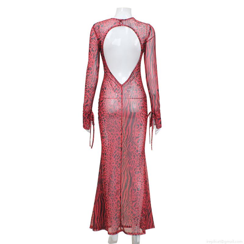 Women Sexy Backless Red Leopard Print Maxi Dress Mesh Sheer Long Sleeve Bodycon Fishtail Evening Party Clubwear Gown Animal Print Round Neck Tie Cuff Elegant Formal Dress