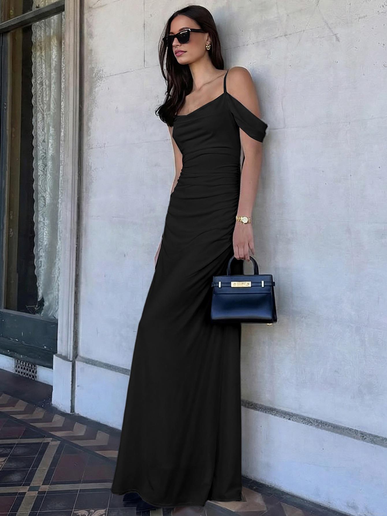 • Women Sexy Backless Side Ruched Maxi Dress Polyester Spandex High Waist Asymmetric Camisole Bodycon Long Dress For Party Cocktail Evening Club