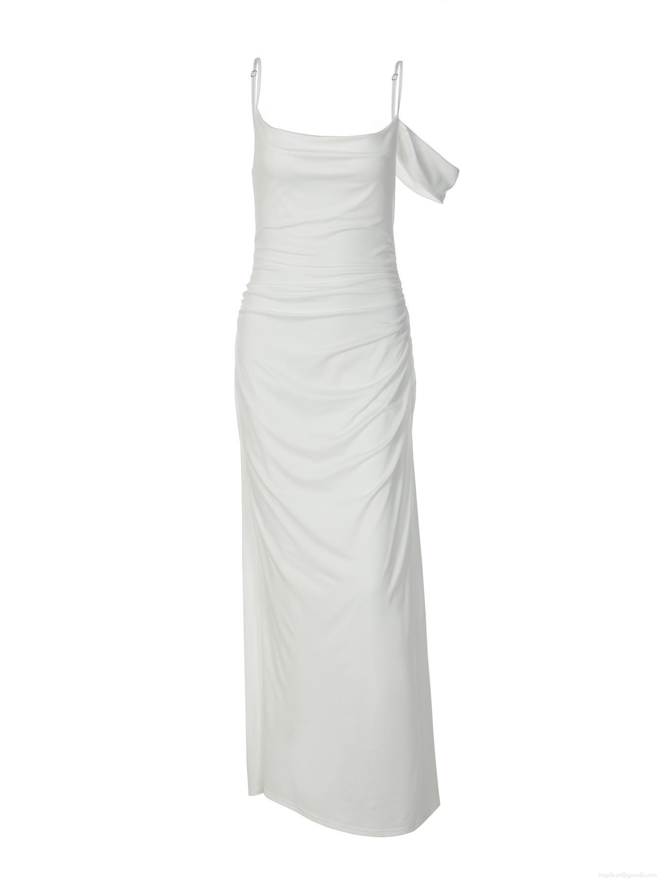 Women Sexy Backless Side Ruched Maxi Dress Polyester Spandex High Waist Asymmetric Camisole Bodycon Long Dress For Party Cocktail Evening Club