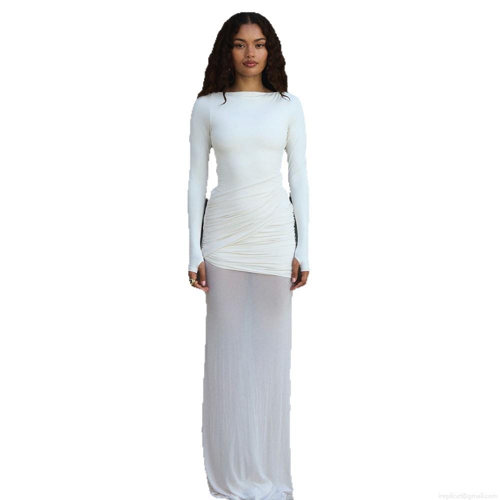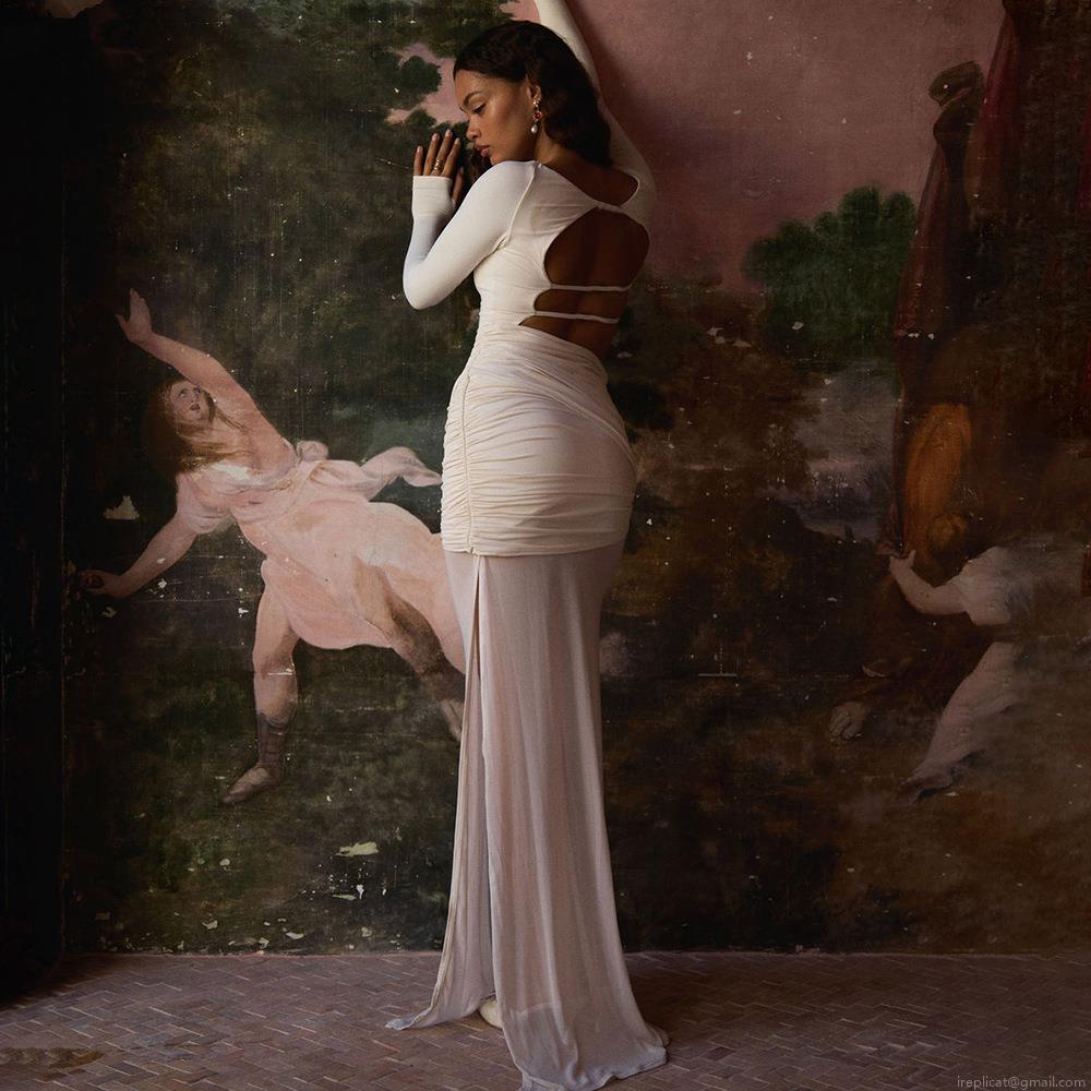 • Women Sexy Backless Side Slit Ruched Maxi Dress Mesh Stitching Long Sleeve Milk Silk Polyester Slim Fit Club Party Night Out Solid Color Elegant Dress