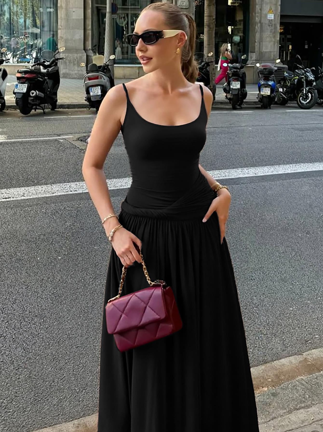 Women Sexy Backless Spaghetti Strap Maxi Dress Polyester Spandex Blend Twist Knot Waist Pleated Slim Fit Summer Vacation Party French Style Elegant Long Dress