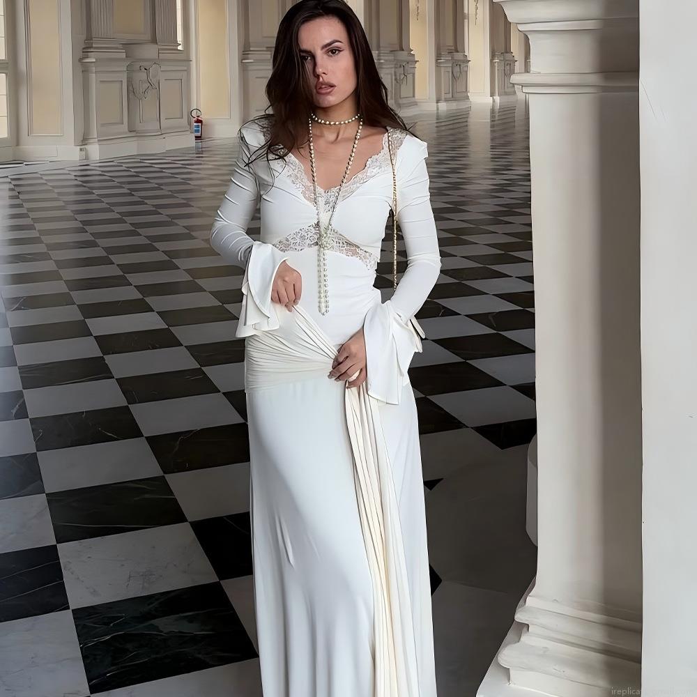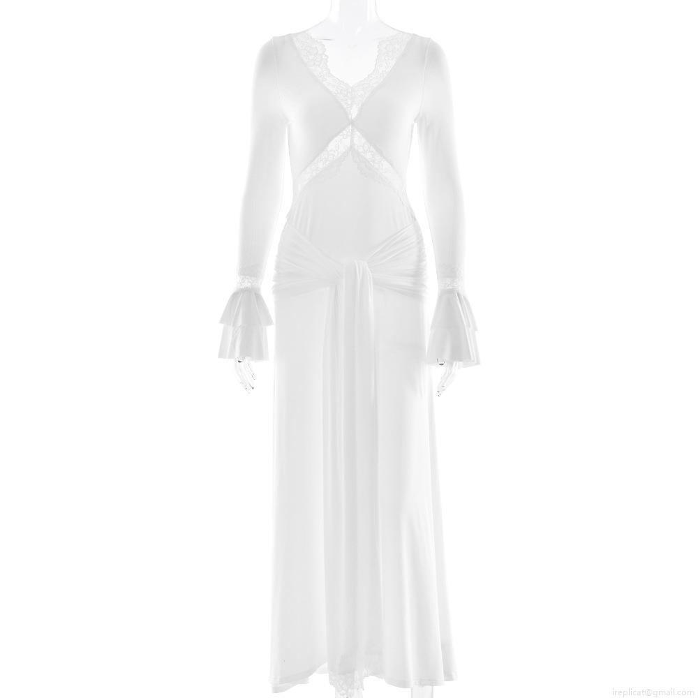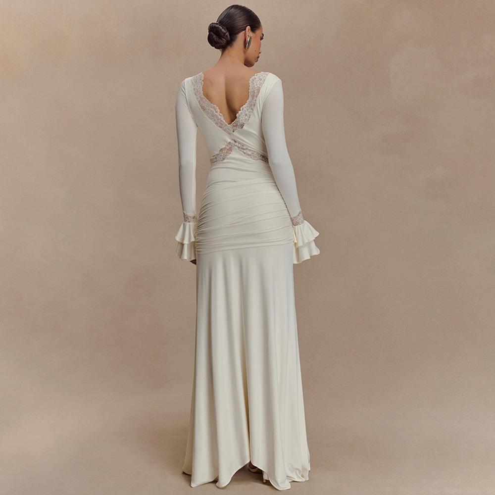 Women Sexy Backless V-Neck Ruched Maxi Dress Elegant Lace Patchwork Bell Sleeve Slim Fit Bodycon Long Skirt Evening Party Clubwear