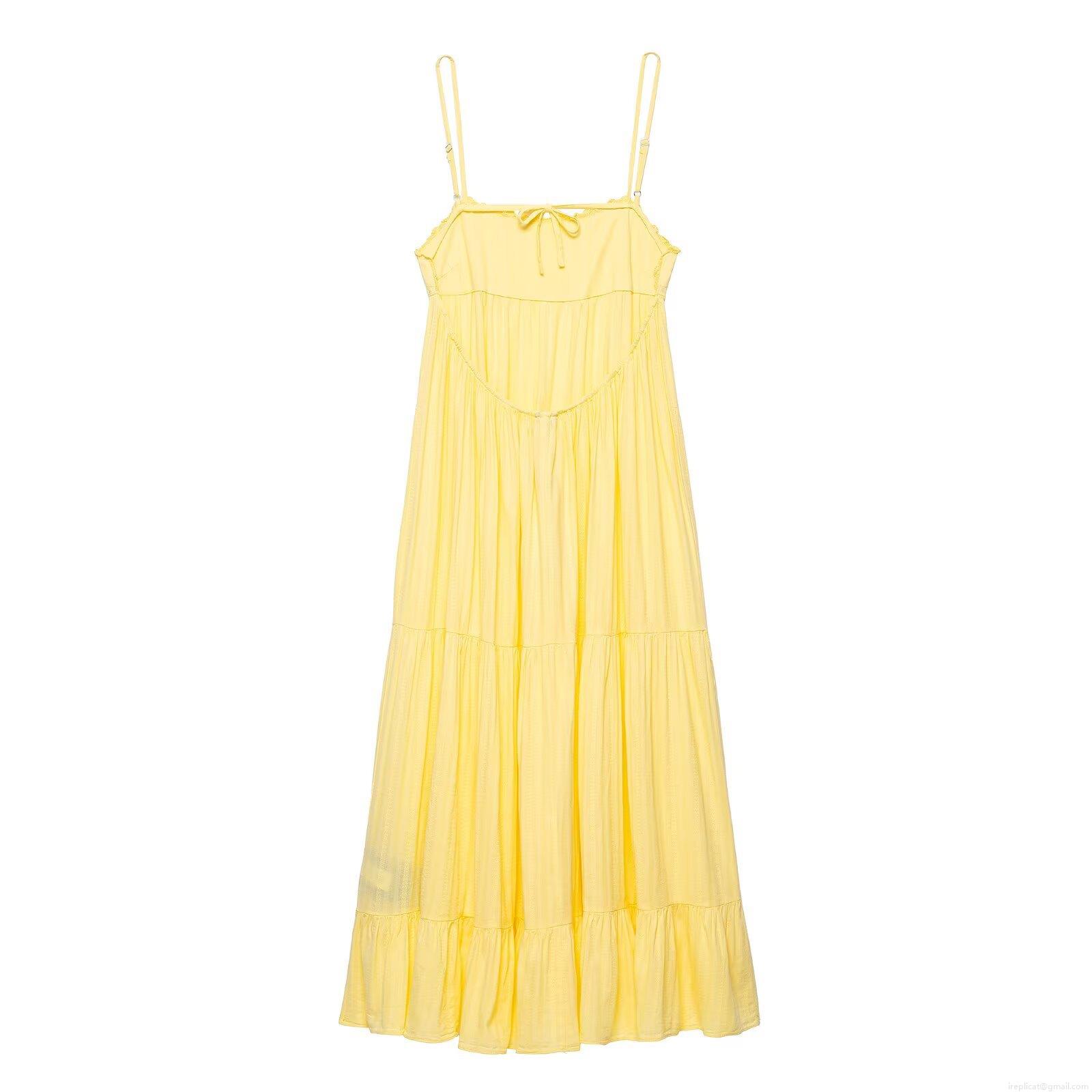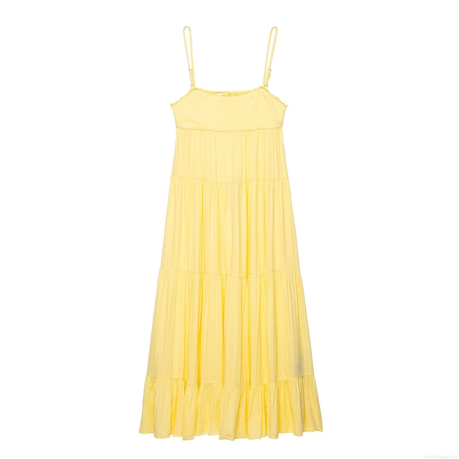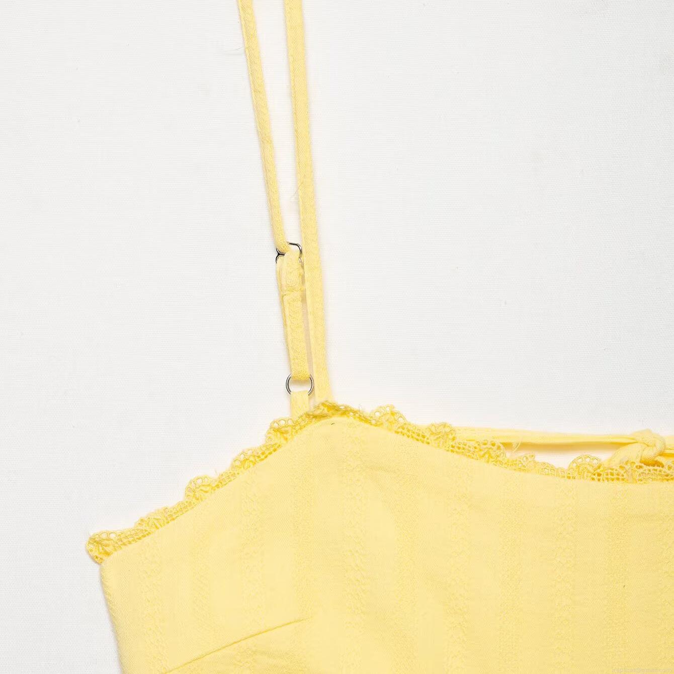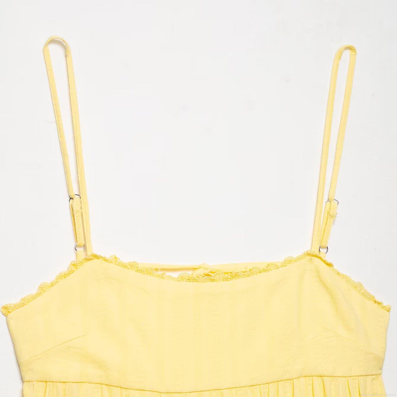 • Women Sexy Backless Yellow Tiered Cake Maxi Dress Polyester Lace Trim Adjustable Spaghetti Straps Summer Beach Resort Sleeveless Long Cami Dresses