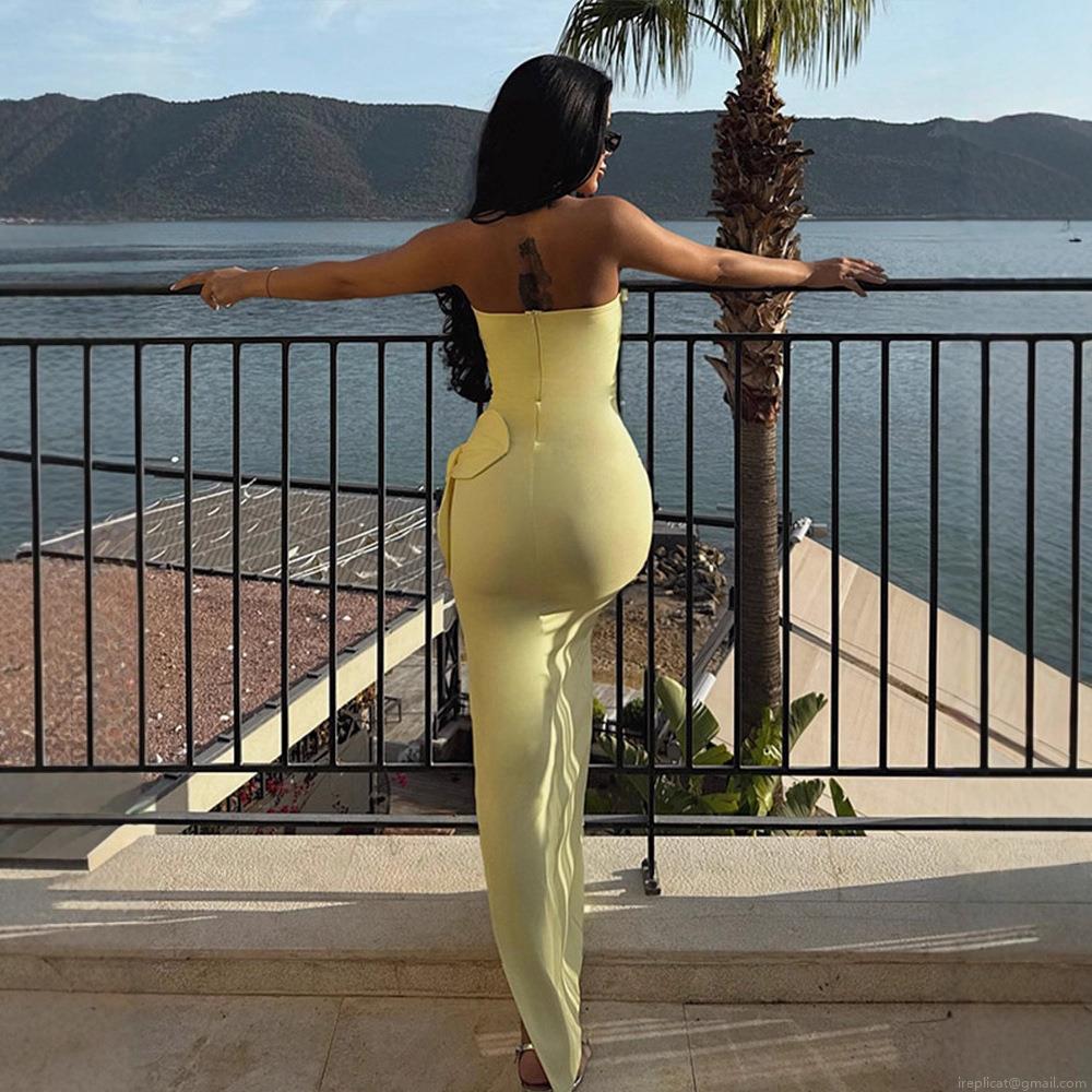 Women Sexy Bandeau 3D Flower Maxi Dress Side Slit Slim Fit Bodycon Elegant Party Long Gown Polyester Evening Summer Vacation Dress