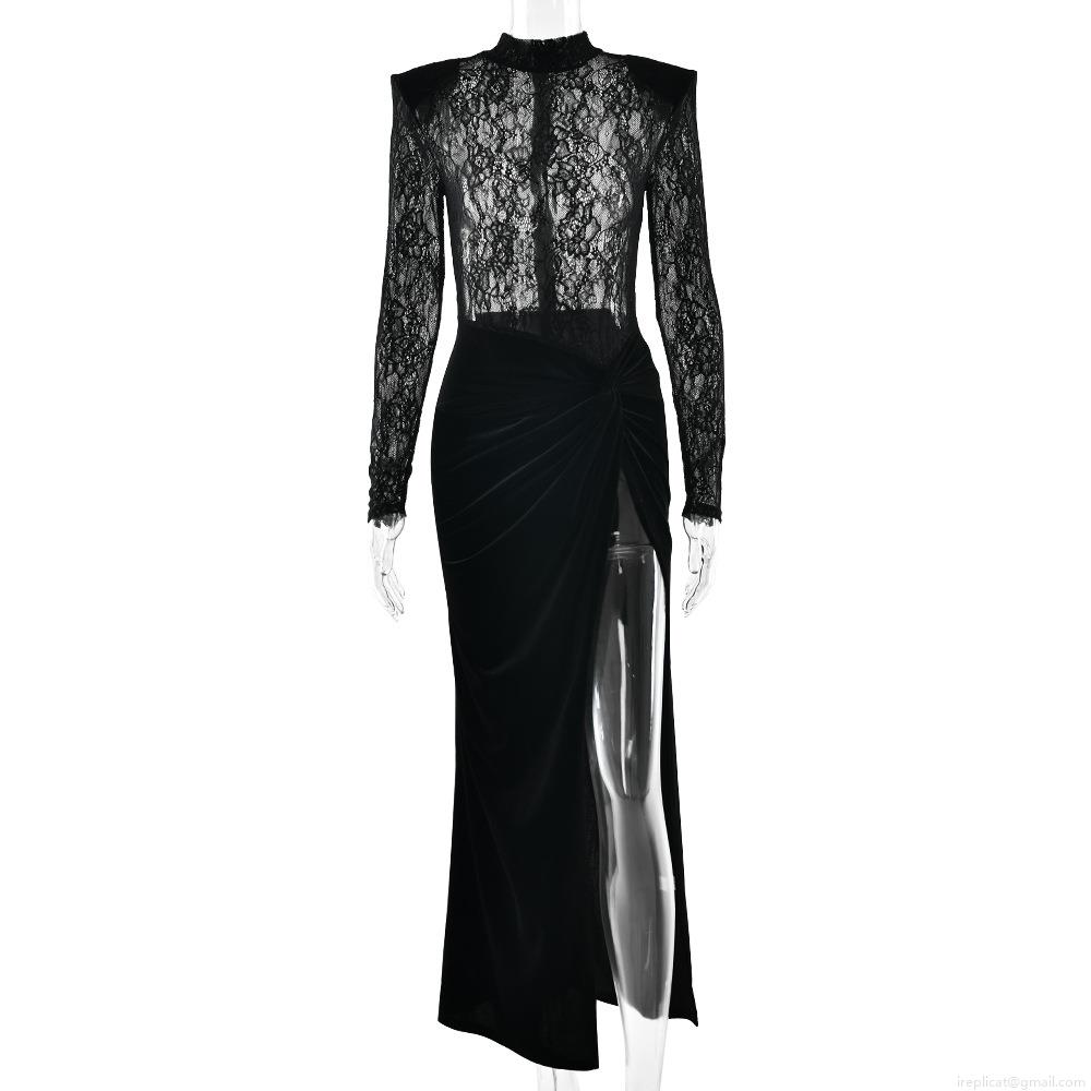 • Women Sexy Black Lace Patchwork Maxi Dress Elegant See-Through Long Sleeve High Slit Velvet Evening Gown For Party Prom Gala