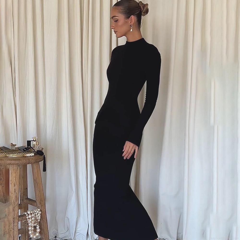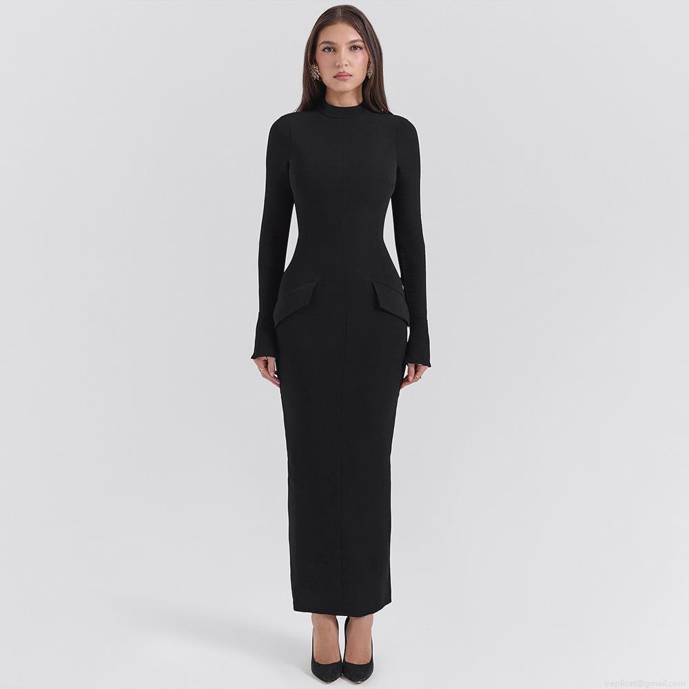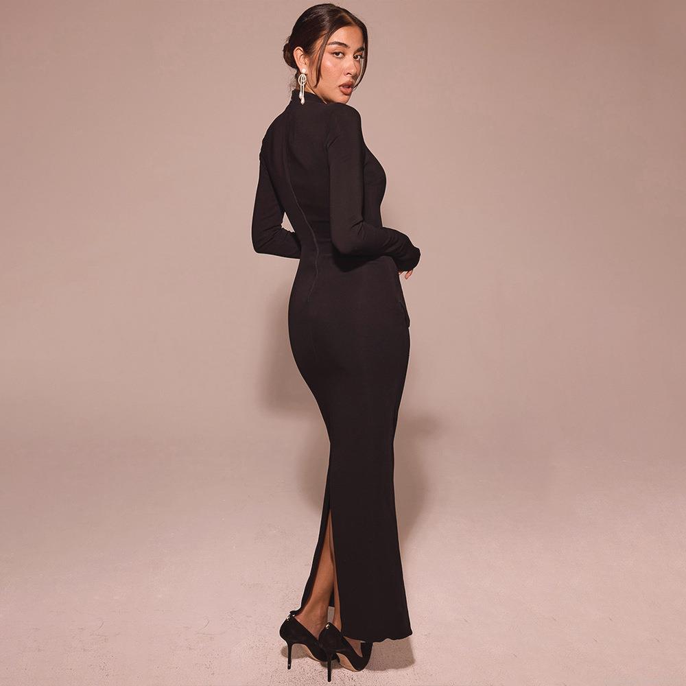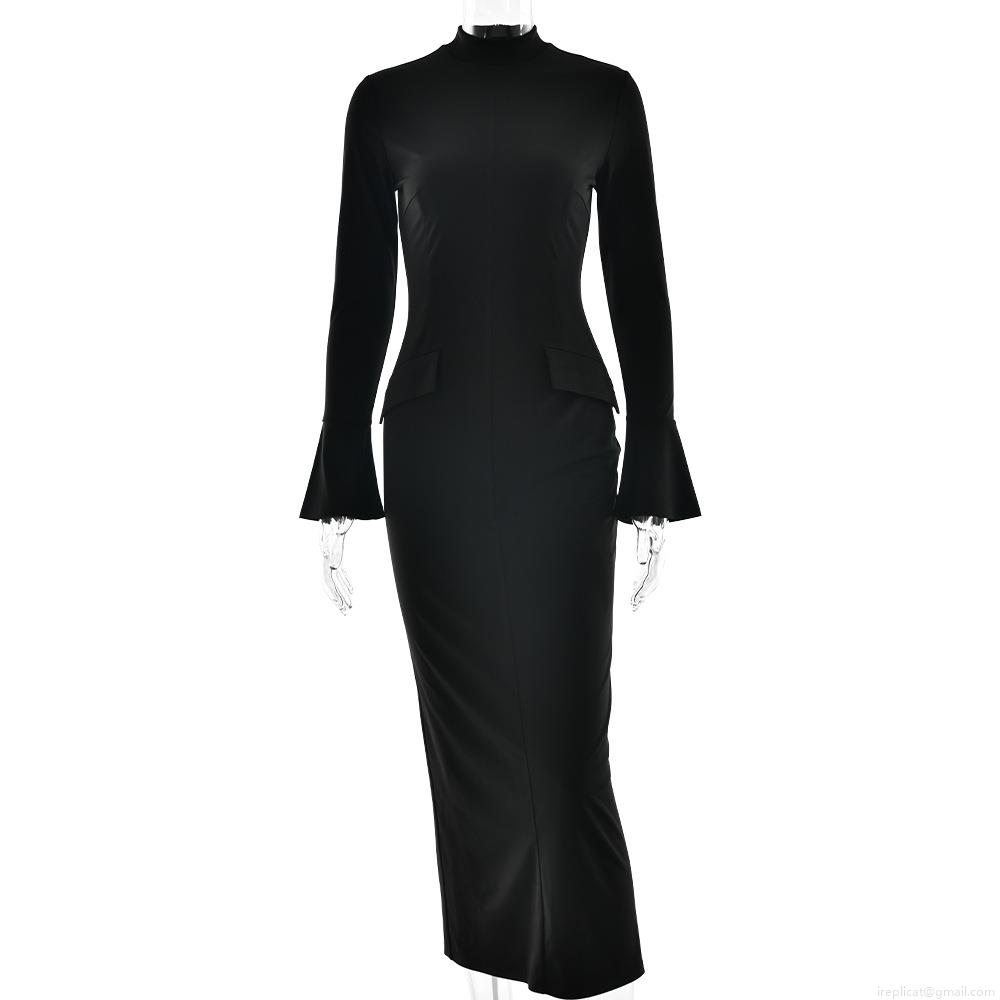 • Women Sexy Bodycon Maxi Dress Elegant Bell Sleeve Round Neck Slim Fit Floor Length Split Evening Party Dress Solid Black Polyester Dress