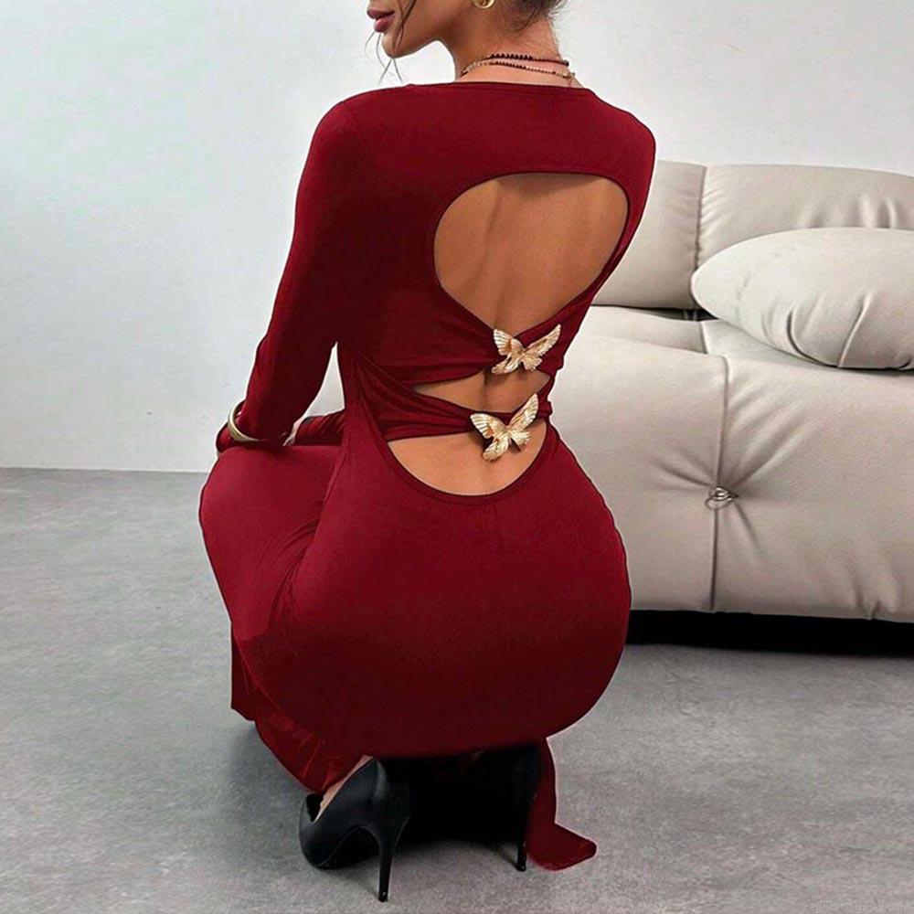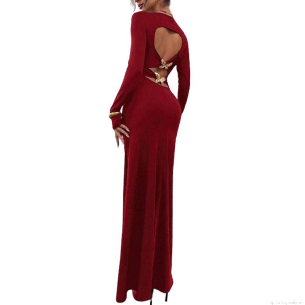 • Women Sexy Bodycon Maxi Dress Long Sleeve Heart Backless Cutout With Gold Butterfly Buckle Knit Burgundy Evening Party Dress Night Club Wear