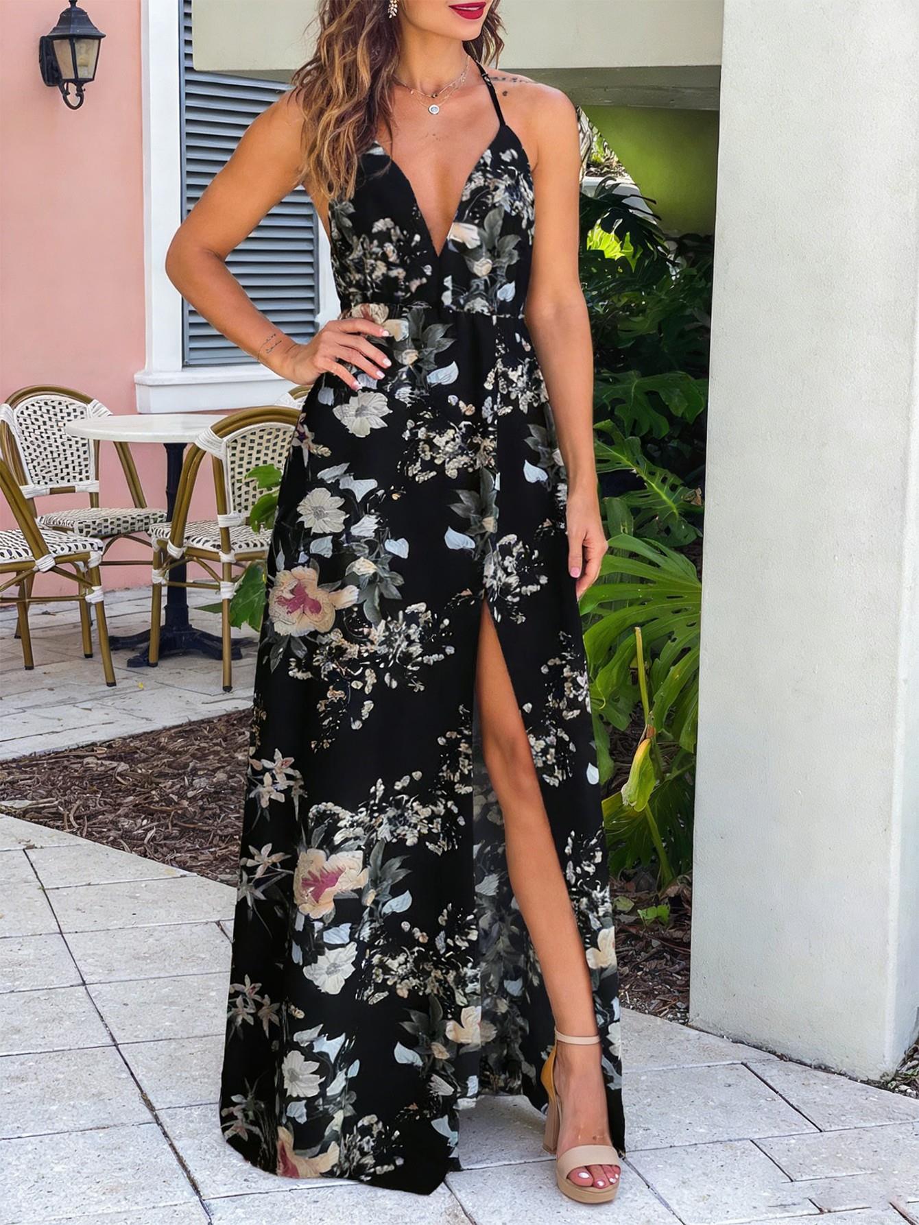 • Women Sexy Bohemian Halter Neck Floral Print Maxi Dress Deep V Backless High Slit Summer Beach Holiday Vacation Long Dress Sleeveless Polyester Outfits