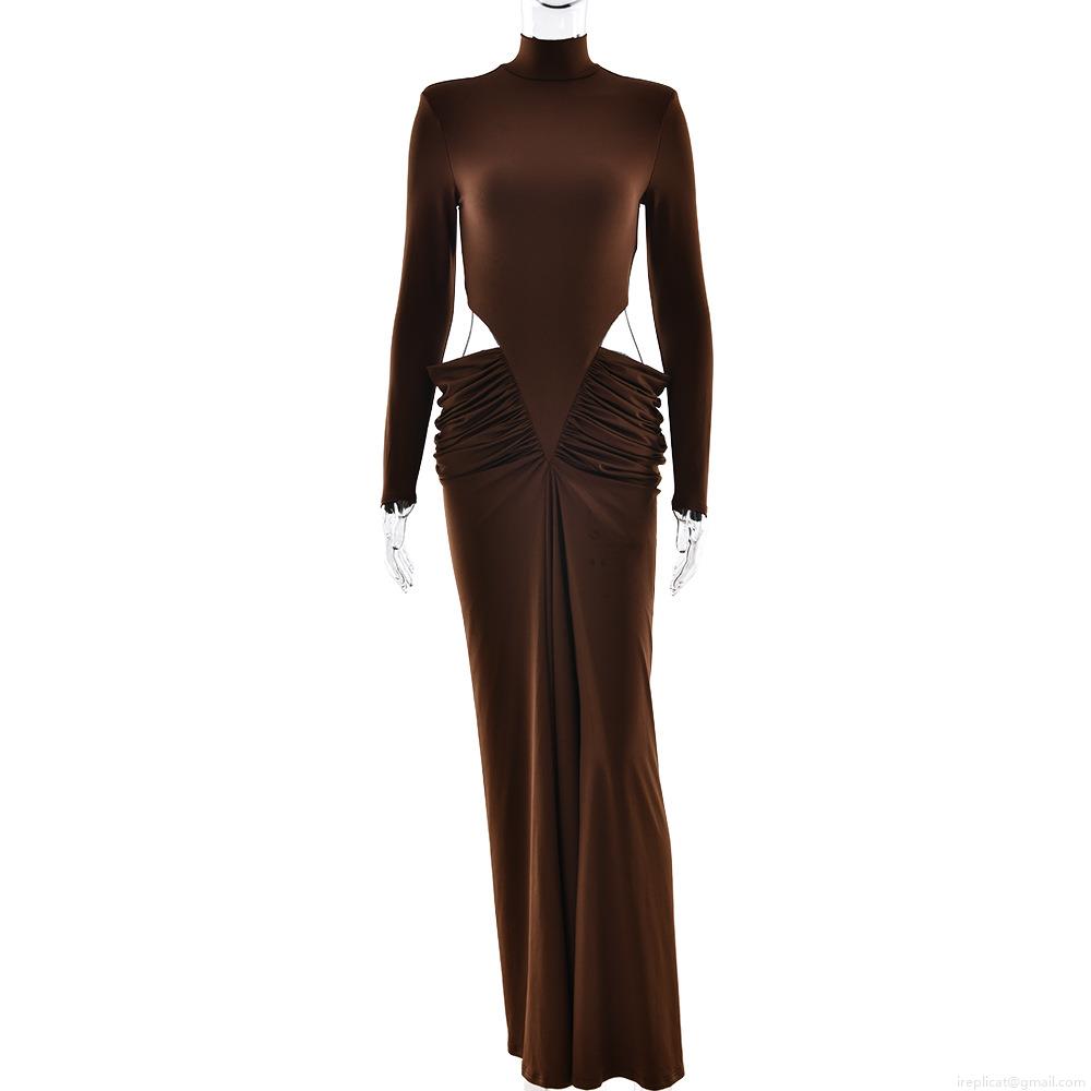 Women Sexy Cut Out Waist Ruched Maxi Dress Mock Neck Long Sleeve Coffee Polyester Milk Silk Slim Fit Bodycon Party Evening Dress