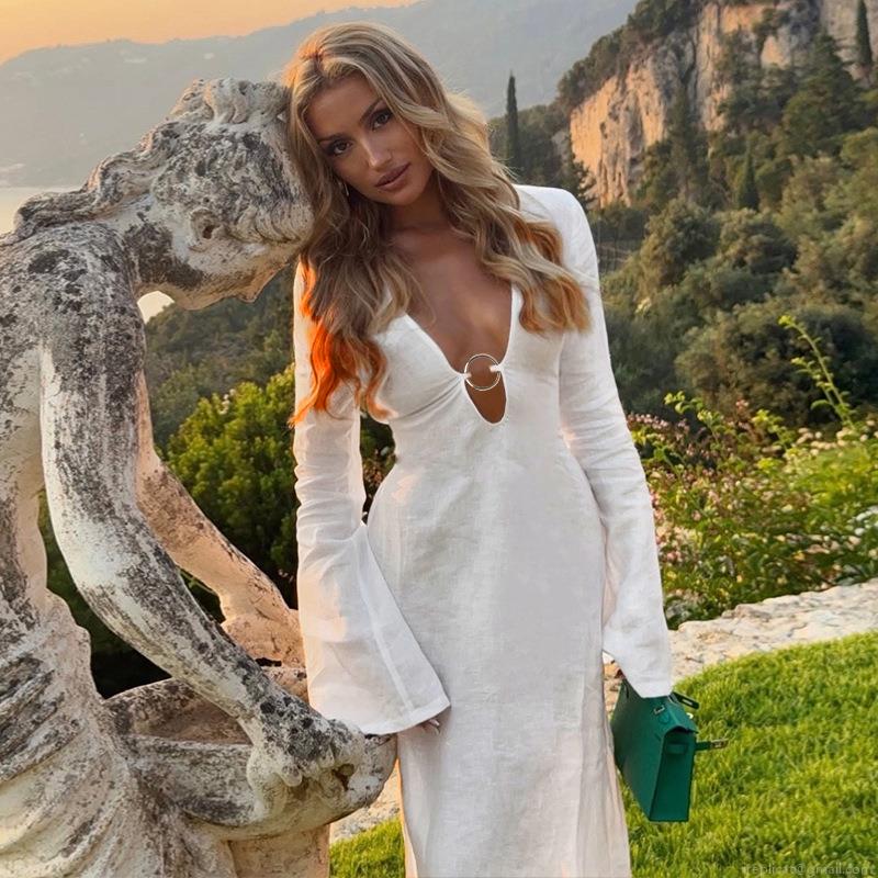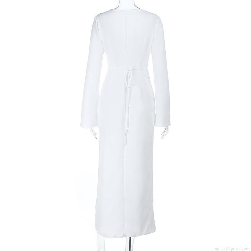 • Women Sexy Deep V-Neck Backless Long Sleeve Maxi Dress With Metal Ring White Polyester Spandex Slim Fit High Slit Vacation Beach Party Dresses