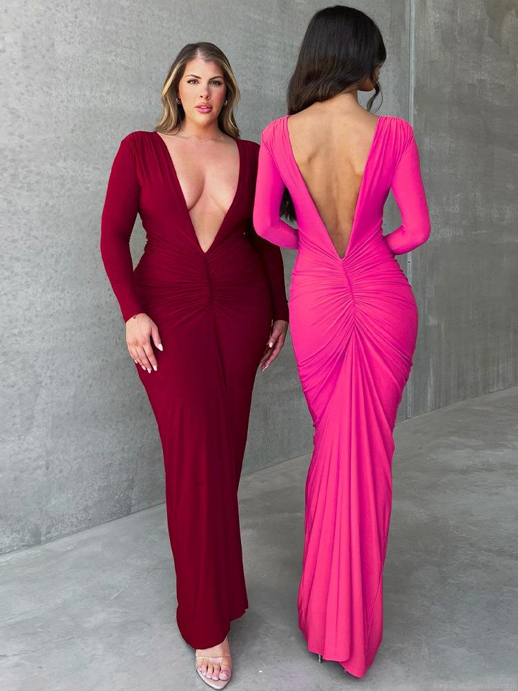 Women Sexy Deep V-Neck Ruched Maxi Dress Long Sleeve Backless Bodycon Evening Party Long Dress Elegant Polyester Spandex Slim Fit Clubwear