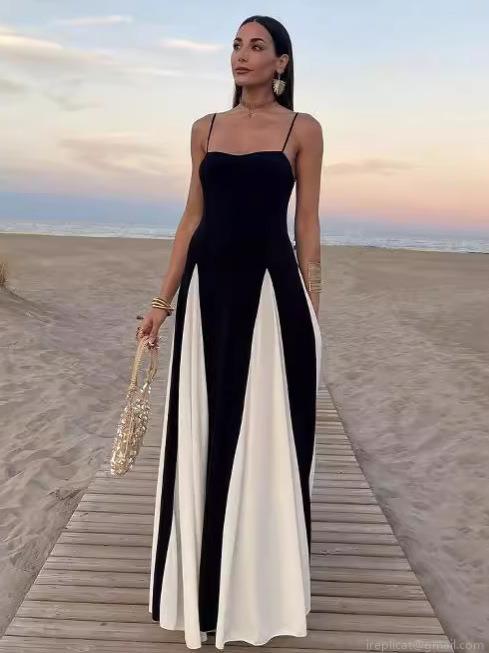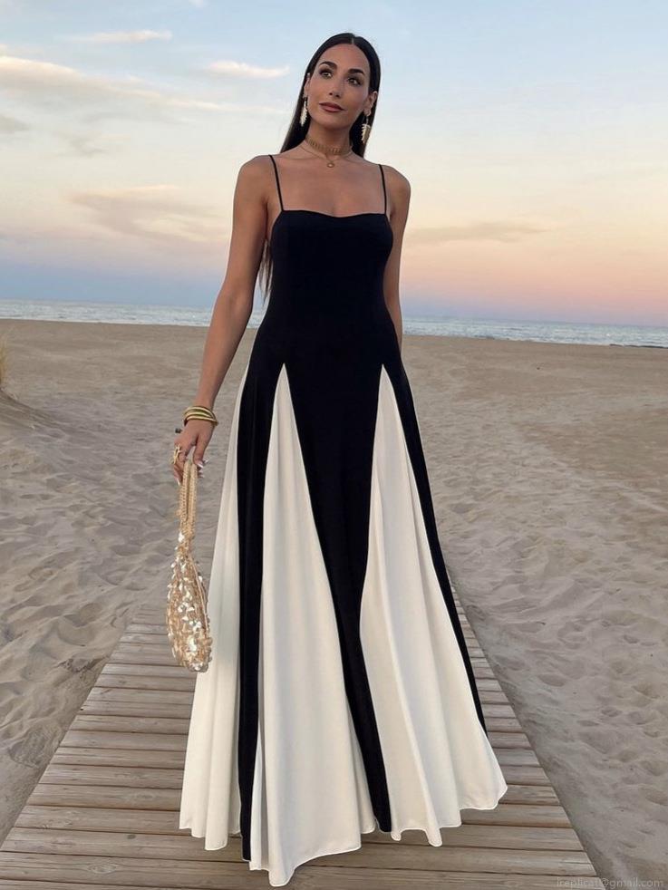 • Women Sexy Elegant Black And White Patchwork Maxi Dress Sleeveless Backless Spaghetti Strap Polyester Long Resort Dress For Summer Vacation Party