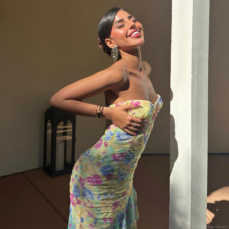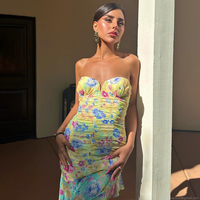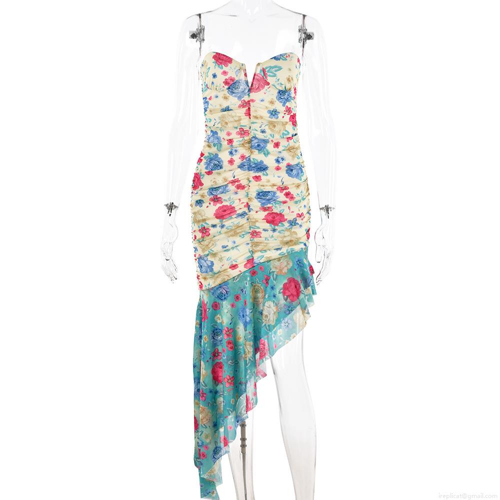 • Women Sexy Floral Print Bandeau Maxi Dress French Vintage Off Shoulder High Waist Pleated Fishtail Skirt With Asymmetric Ruffle Hem Summer Beach Vacation Party Outfits