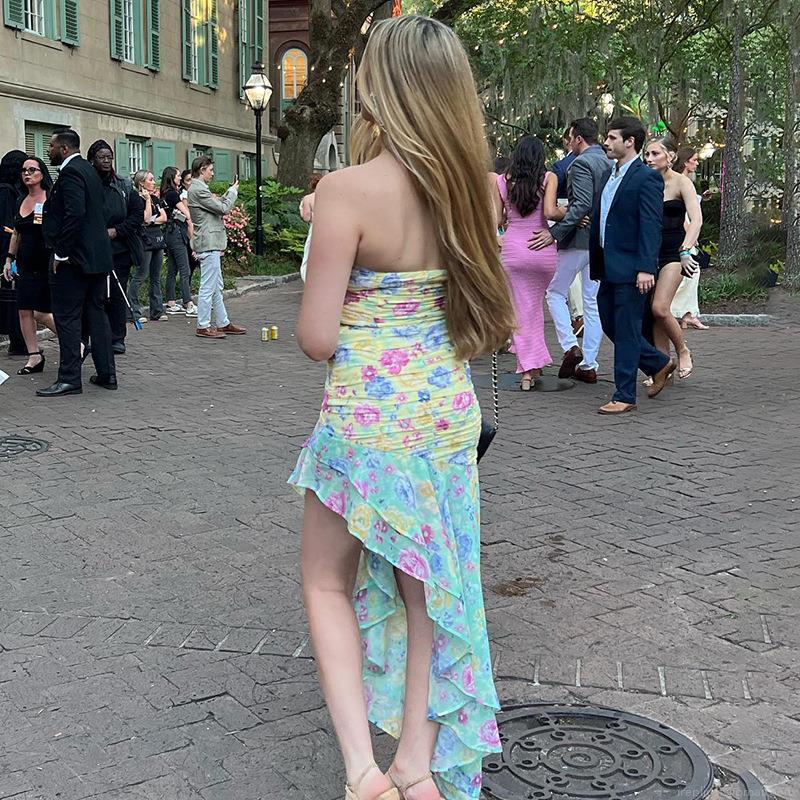 Floral Pattern, Pleats, Ruffles, Plants And Flowers, Rose, Backless, Irregular Hem, Invisible Zipper, Metal V-shaped Fixing