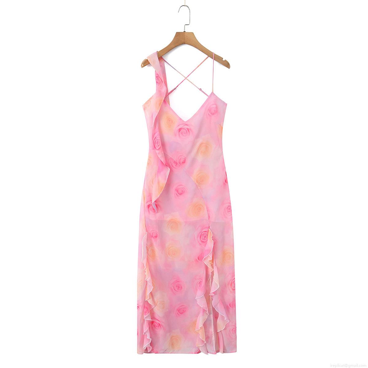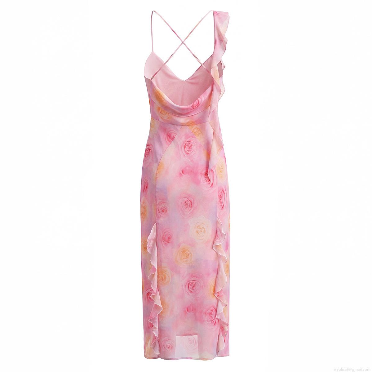 • Women Sexy Floral Print Maxi Dress Polyester Ruffle Hem Irregular Backless V Neck Spaghetti Strap Slit Long Dress For Vacation Party