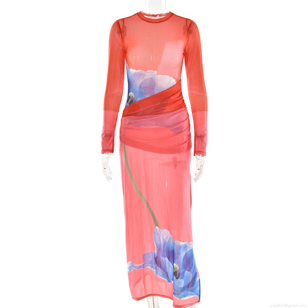 • Women Sexy Floral Print Mesh Maxi Dress Long Sleeve Round Neck Ruched High Slit Bodycon Long Skirt for Party Club Autumn Slim Fit Milk Silk Printed Dress