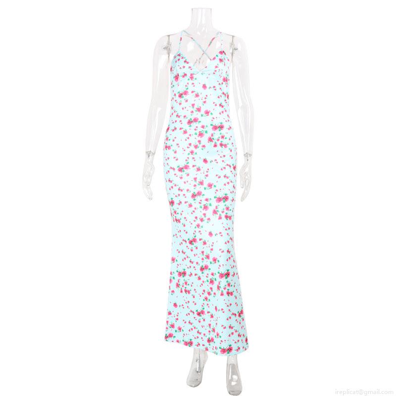• Women Sexy Floral Slip Maxi Dress Polyester Spandex Deep V-Neck Backless Slim Fit Summer Vacation Long Dress For Elegant Ladies