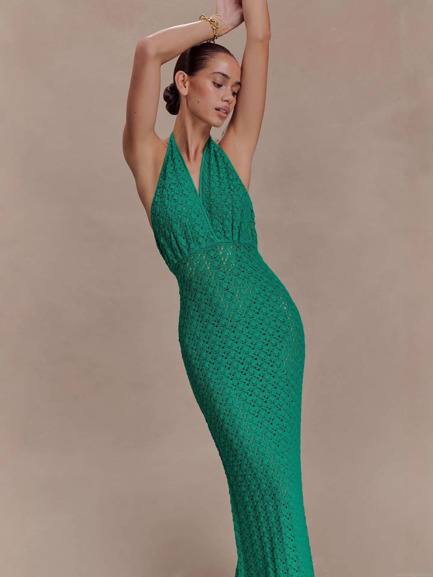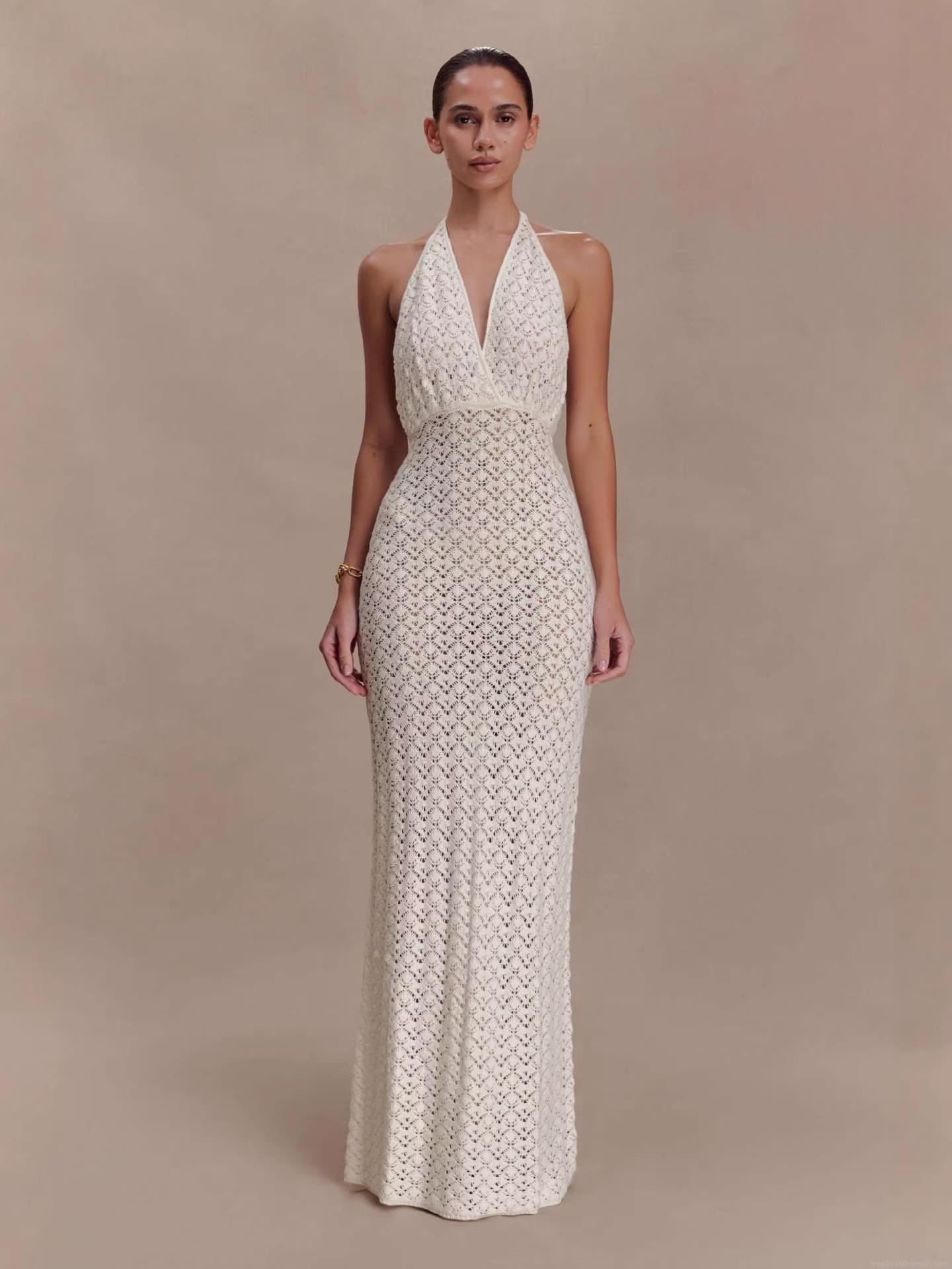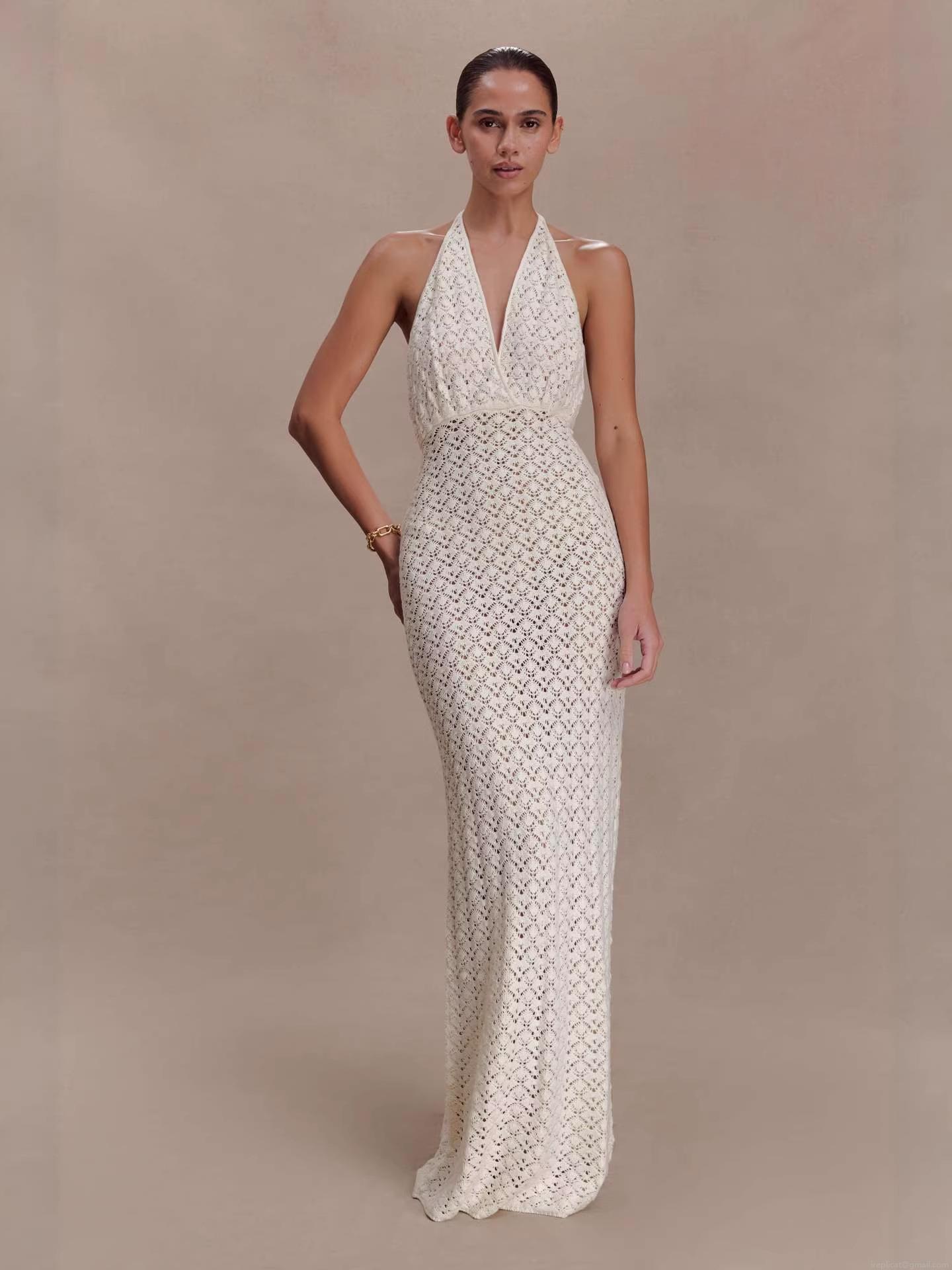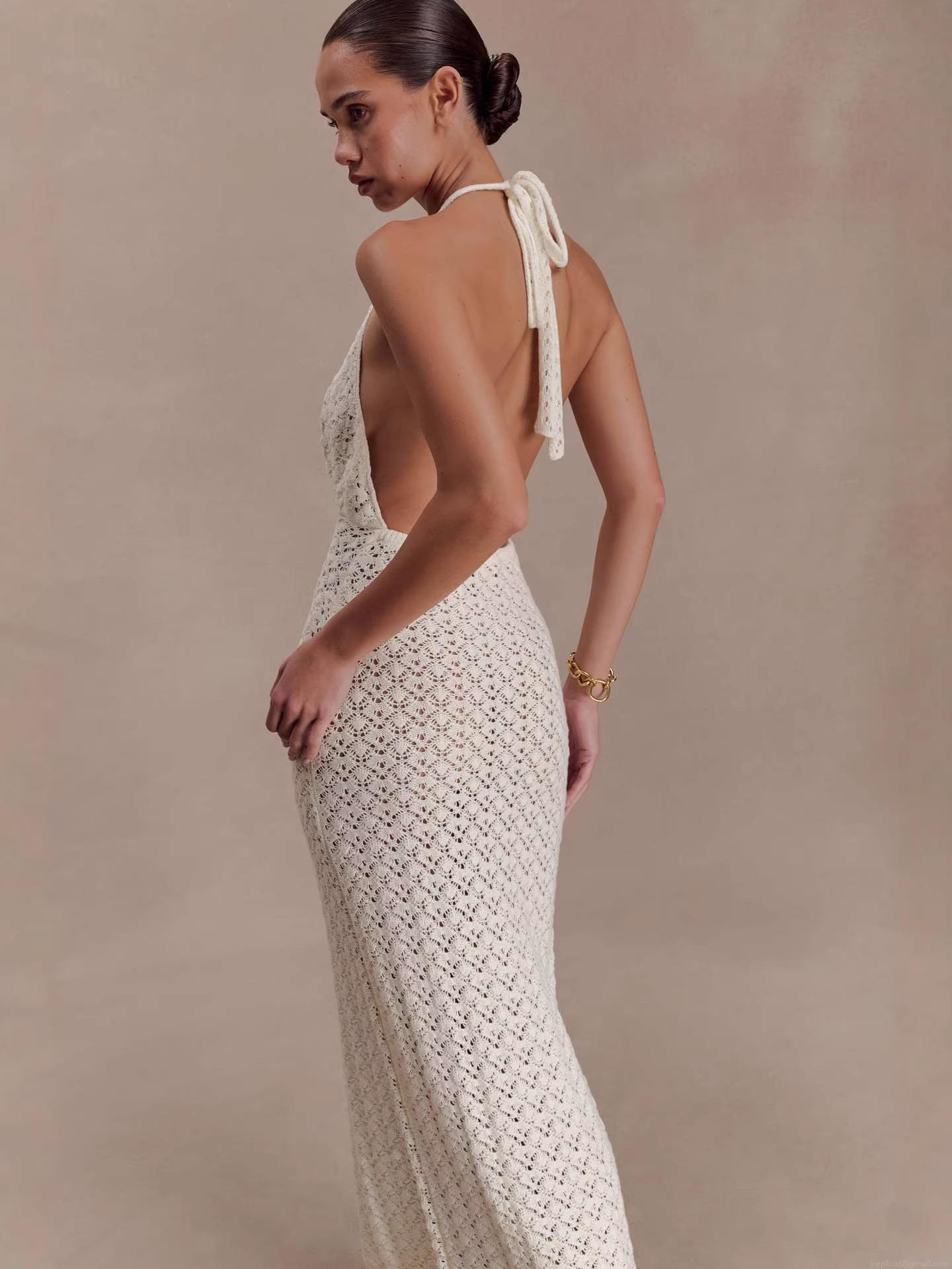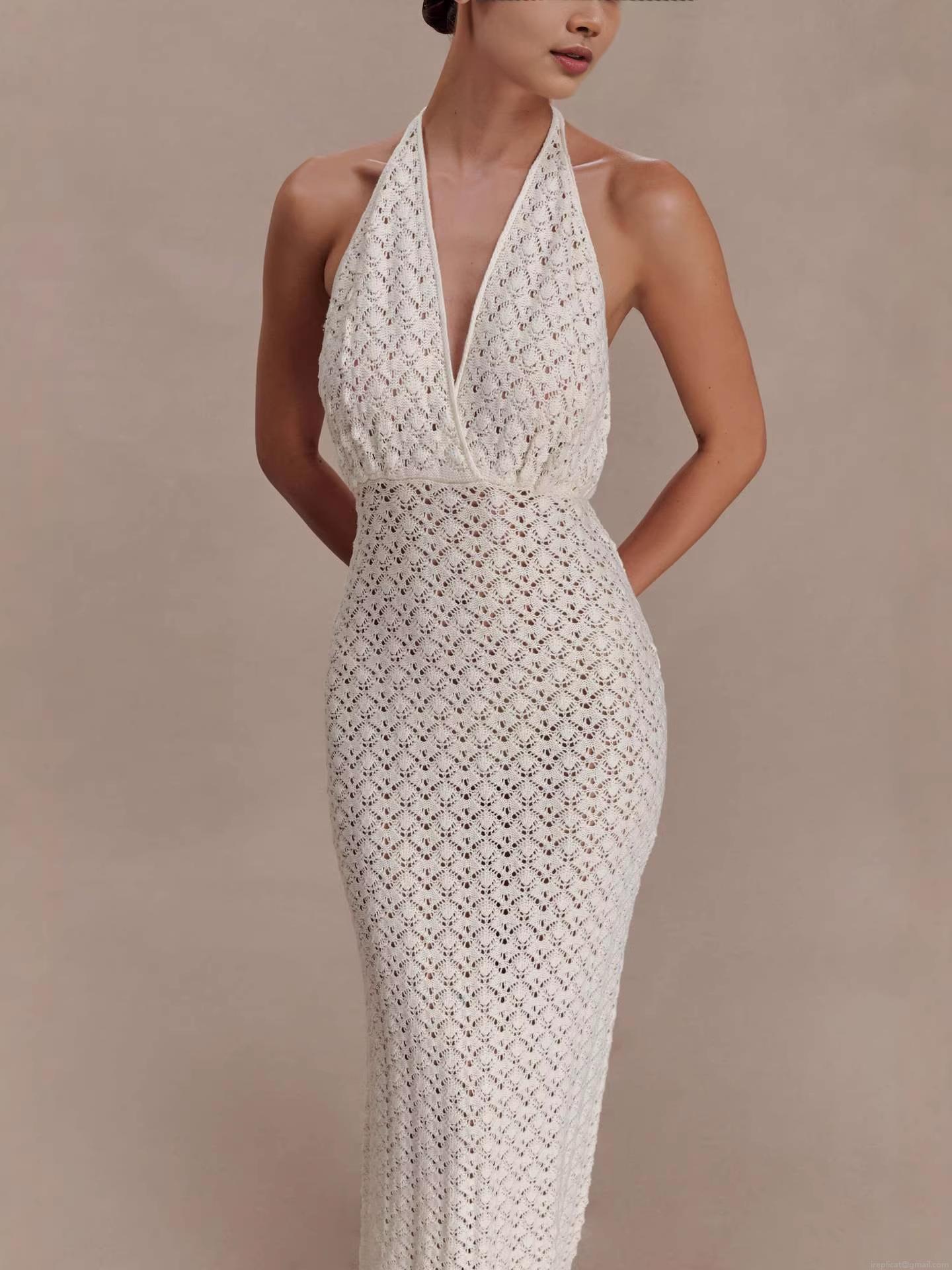 • Women Sexy Halter Backless Crochet Knit Maxi Dress Hollow Out Tie Back Slim Fit Beach Long Dress Party Clubwear Summer Vacation