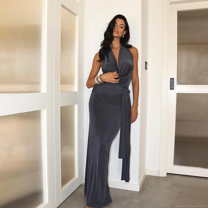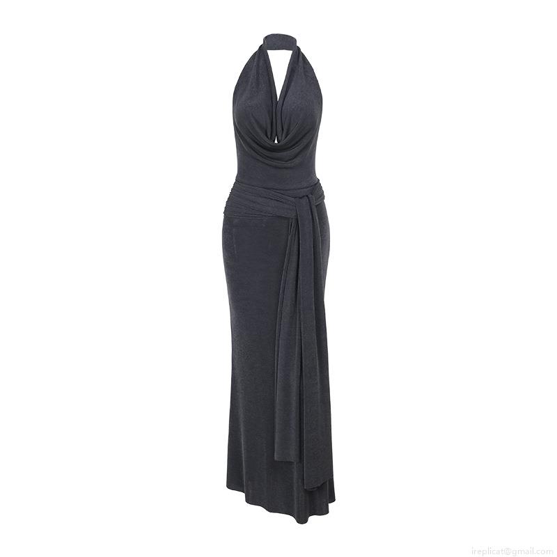 • Women Sexy Halter Backless Maxi Dress Slim Fit Cowl Neck Tie Waist Solid Color Polyester Spandex Long Dress For Evening Party Vacation