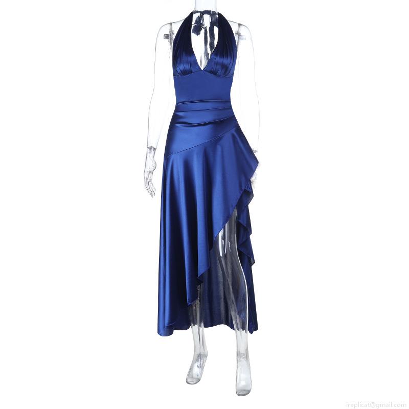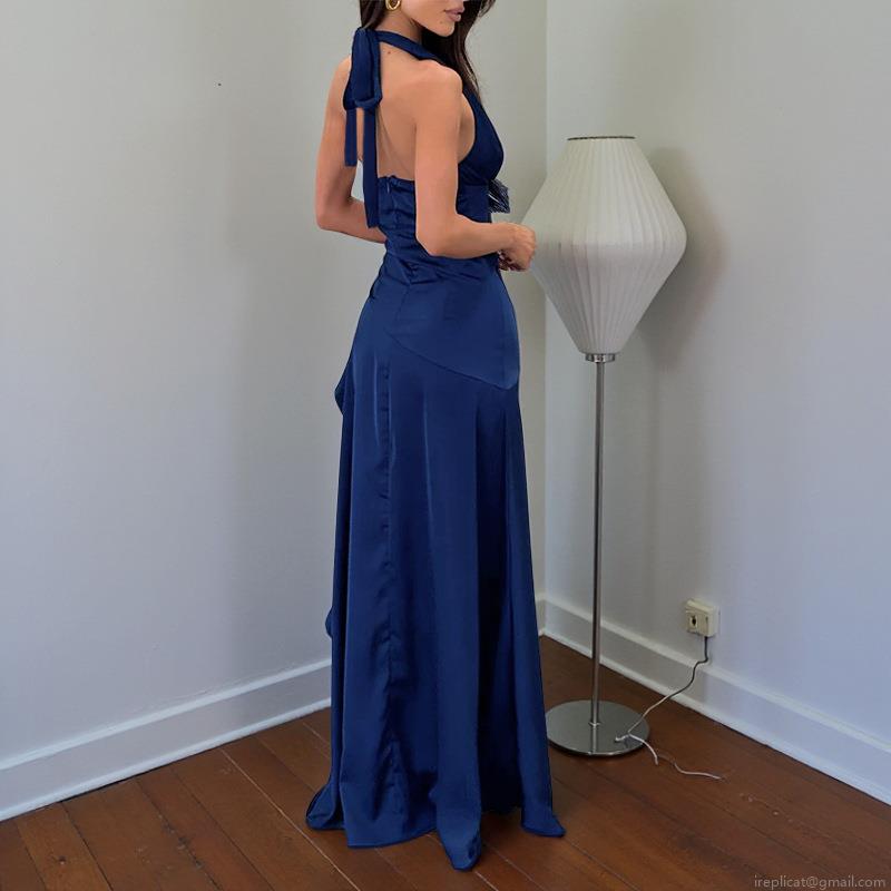 • Women Sexy Halter Deep V-Neck Backless Maxi Dress Satin High Slit Ruched Slim Fit Evening Party Gown Elegant Solid Navy Blue Sleeveless Prom Dress