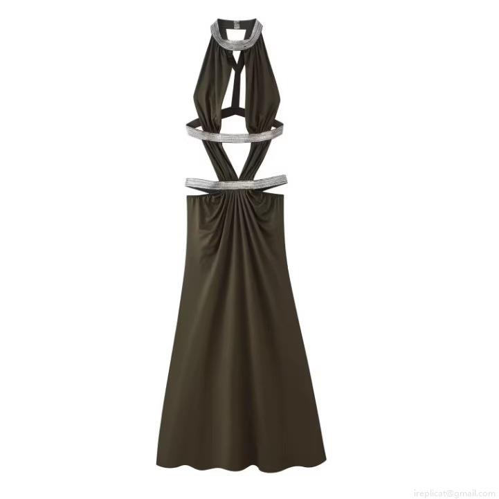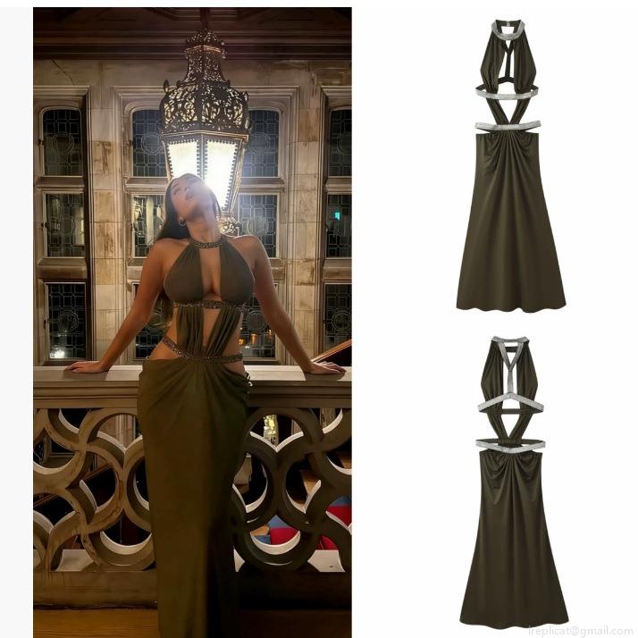• Women Sexy Halter Neck Backless Hollow Out Maxi Dress With Rhinestone Decoration Stretch Polyester Bodycon Long Party Evening Gown Elegant Socialite Dress