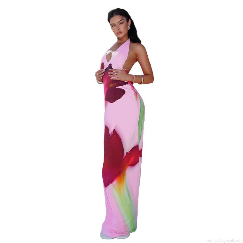 • Women Sexy Halter Neck Backless Maxi Dress Large Floral Print Polyester Spandex Slim Fit Beach Vacation Long Dress Party Wear