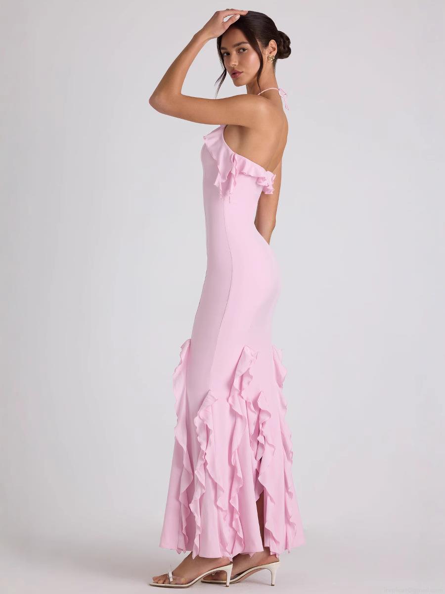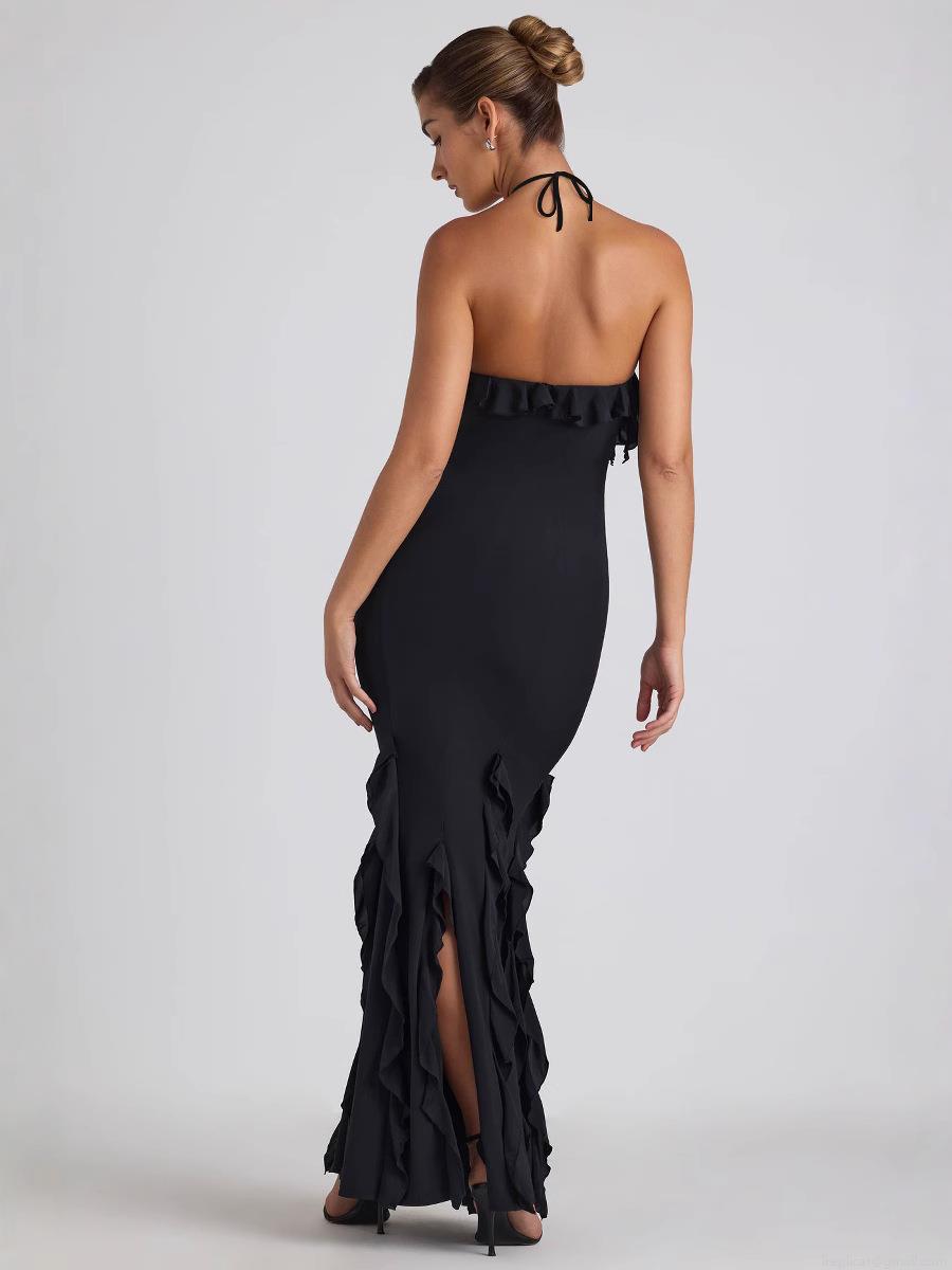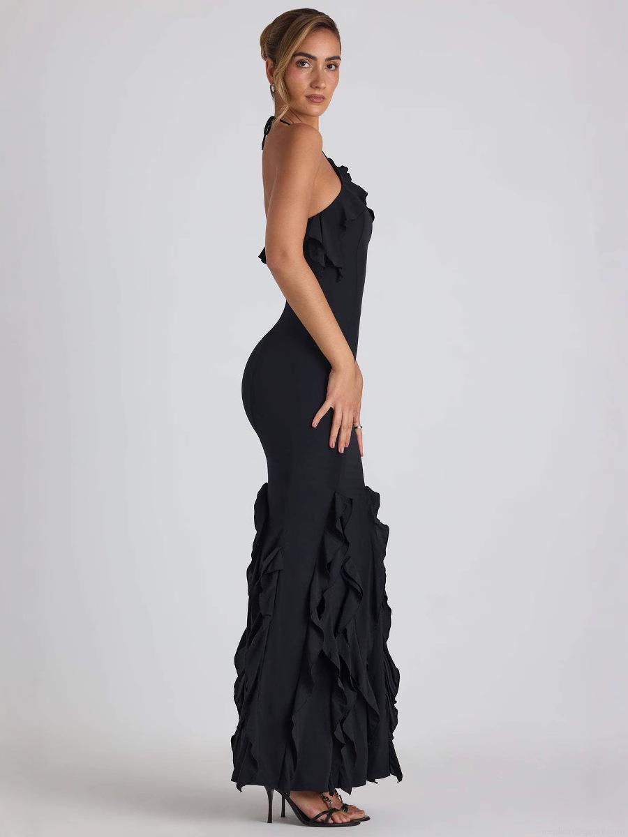 • Women Sexy Halter Neck Backless Maxi Dress Milk Silk Ruffle Pleated Mermaid Evening Gowns Elegant Formal Party Dress For Women Bodycon Silhouette