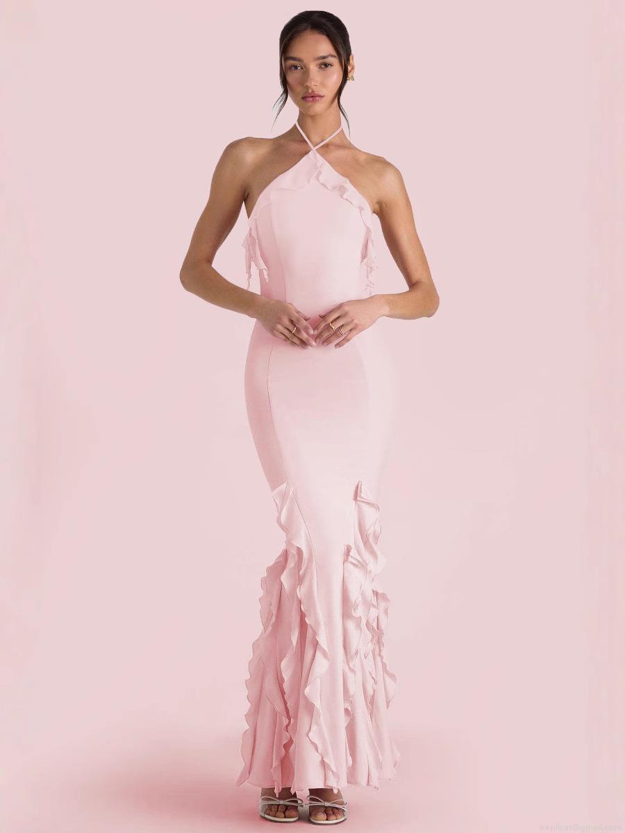 Women Sexy Halter Neck Backless Maxi Dress Milk Silk Ruffle Pleated Mermaid Evening Gowns Elegant Formal Party Dress For Women Bodycon Silhouette