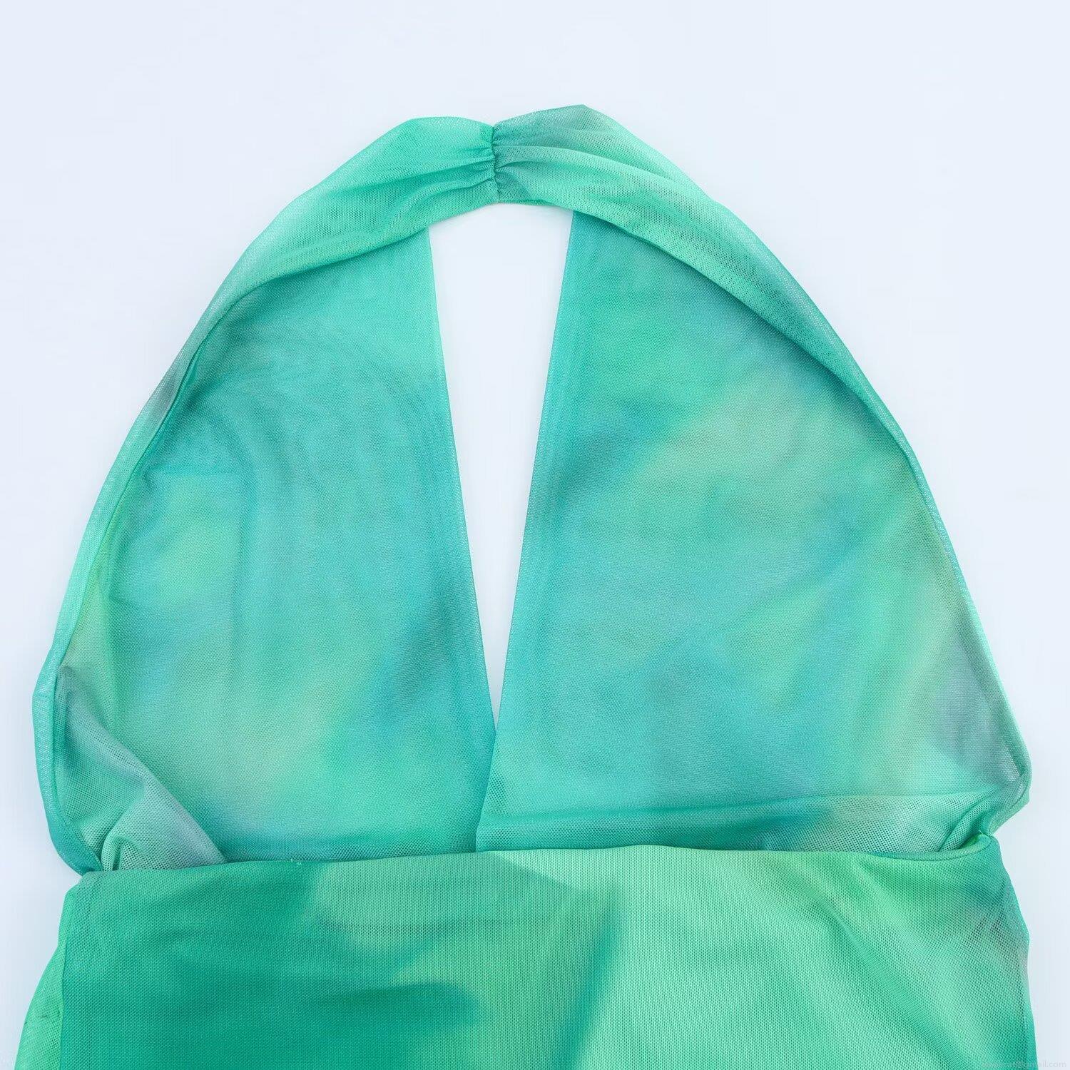 Gradient, Pleats, Printing, Mesh, Neckband, Backless, Abstract Flowers, Gradient Print
