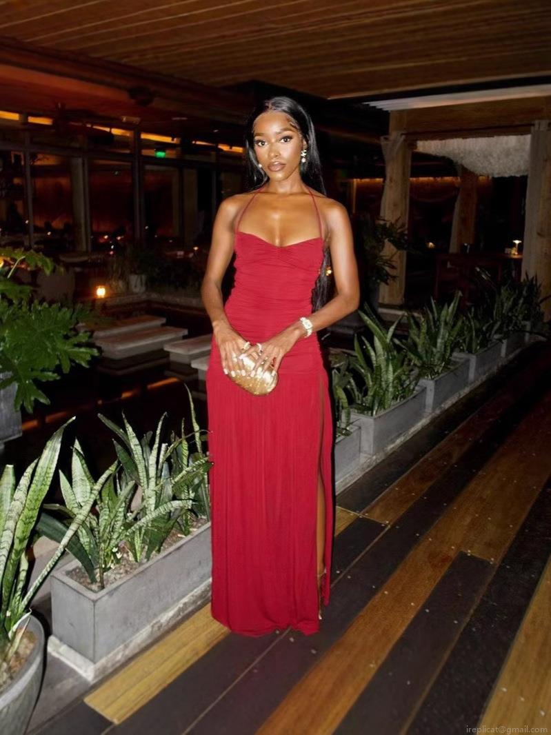 Women Sexy Halter Neck Backless Ruched Maxi Dress High Side Split Slim Fit Milk Silk Blend Polyester Evening Party Bodycon Dress