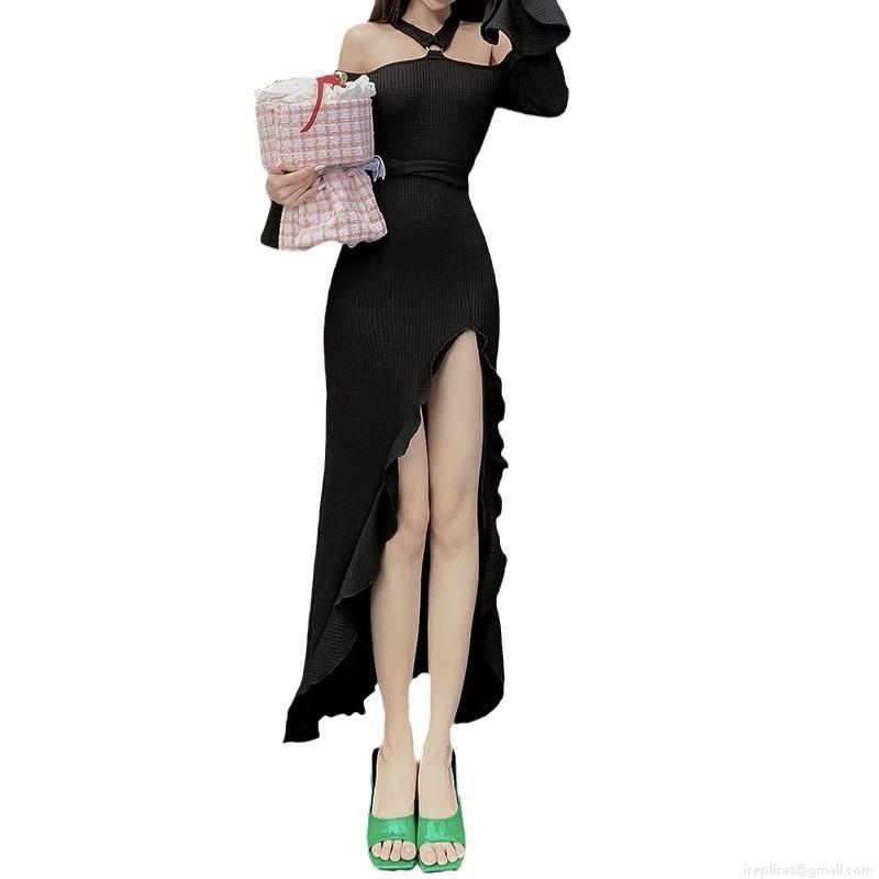 • Women Sexy Halter Neck Cutout Tied Maxi Dress Flared Sleeve Ruffle Slit Bodycon Long Dress Solid Color Elegant Party Clubwear
