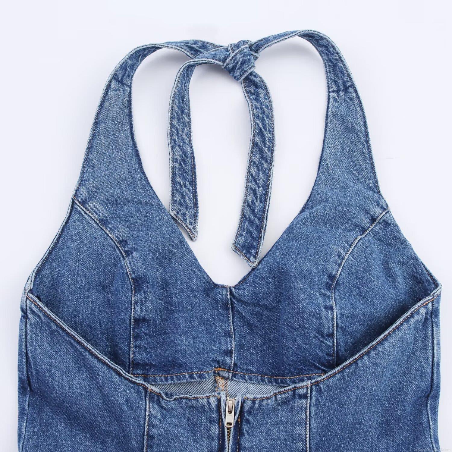 • Women Sexy Halter Neck Denim Maxi Dress V Neck Backless Lace Up A-Line Long Jean Sundress For Party Clubwear Solid Blue Wash Denim Dress
