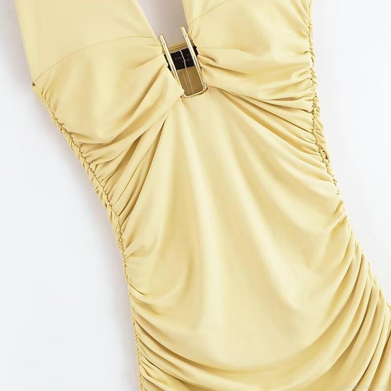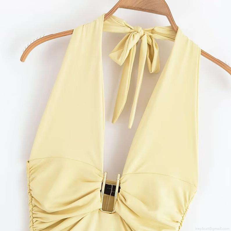 • Women Sexy Halter Neck Maxi Dress Light Yellow Ruched Deep V-Neck With Gold Metal Buckle Elegant Sleeveless Backless High Waist Bodycon Long Dress For Party Vacation Evening