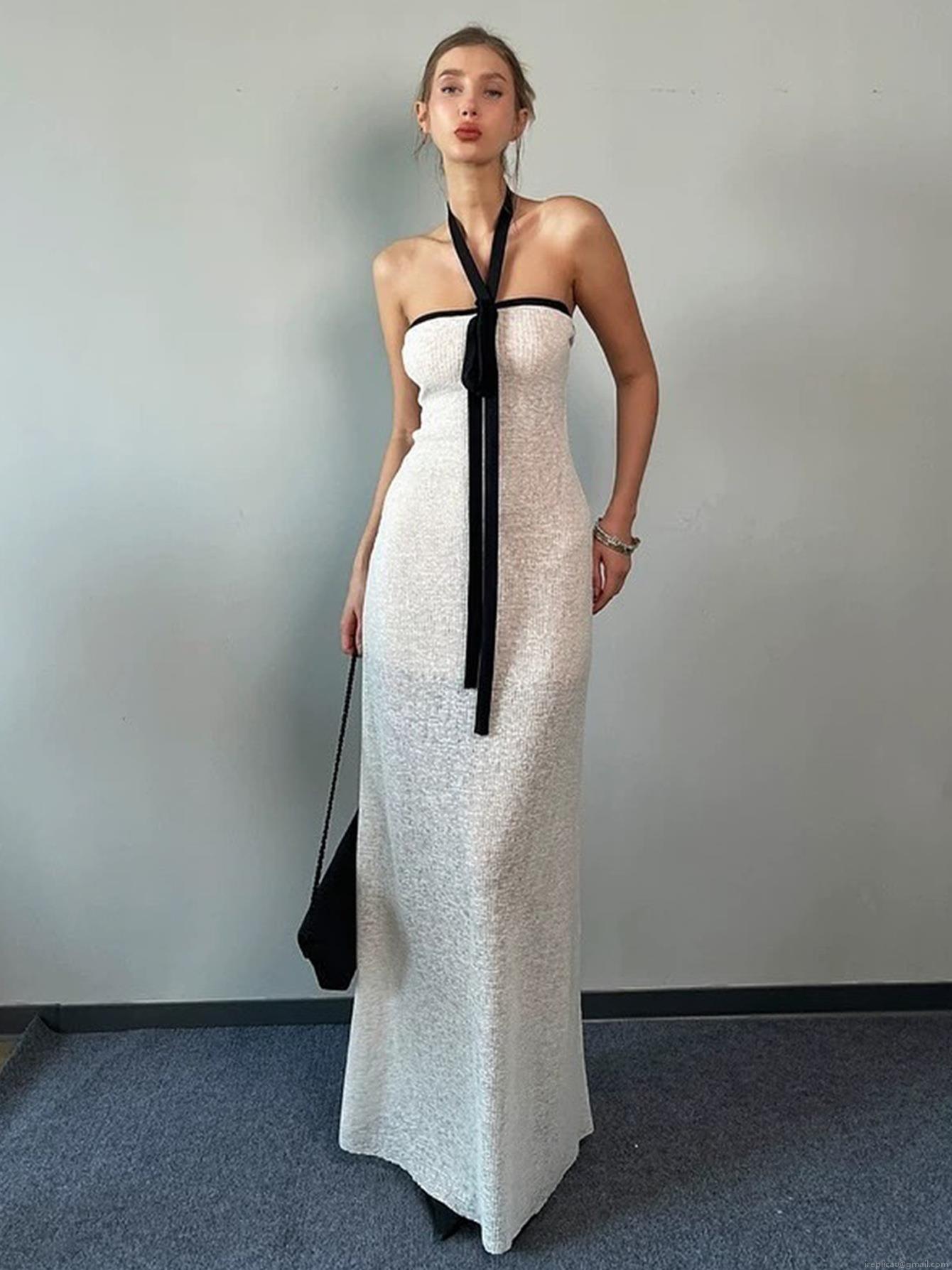 Women Sexy Halter Neck Maxi Dress Polyester Spandex Ribbed Knit Black Tie Backless Slim Fit Sleeveless Long Dresses Summer Elegant White Sun Dress