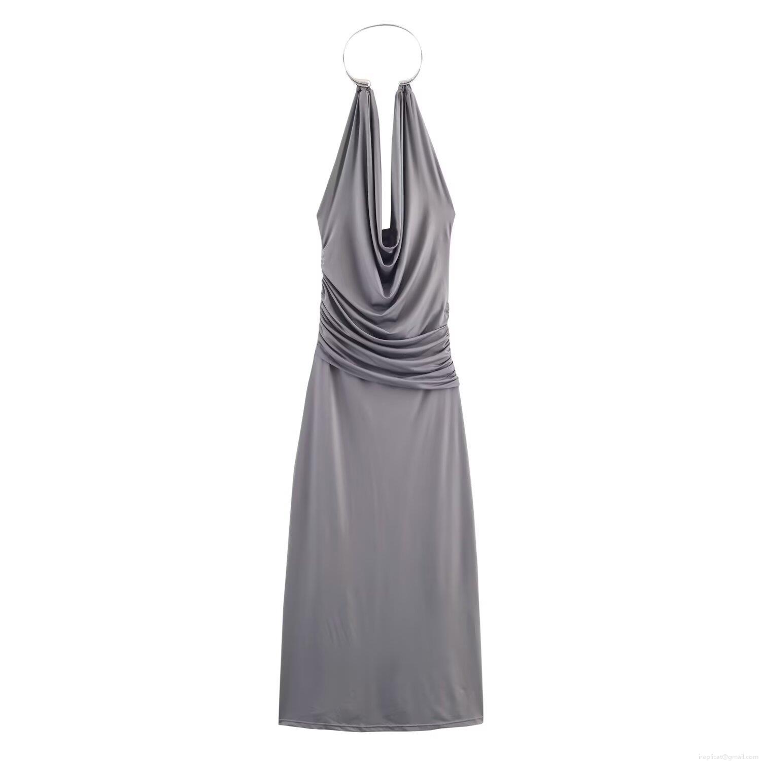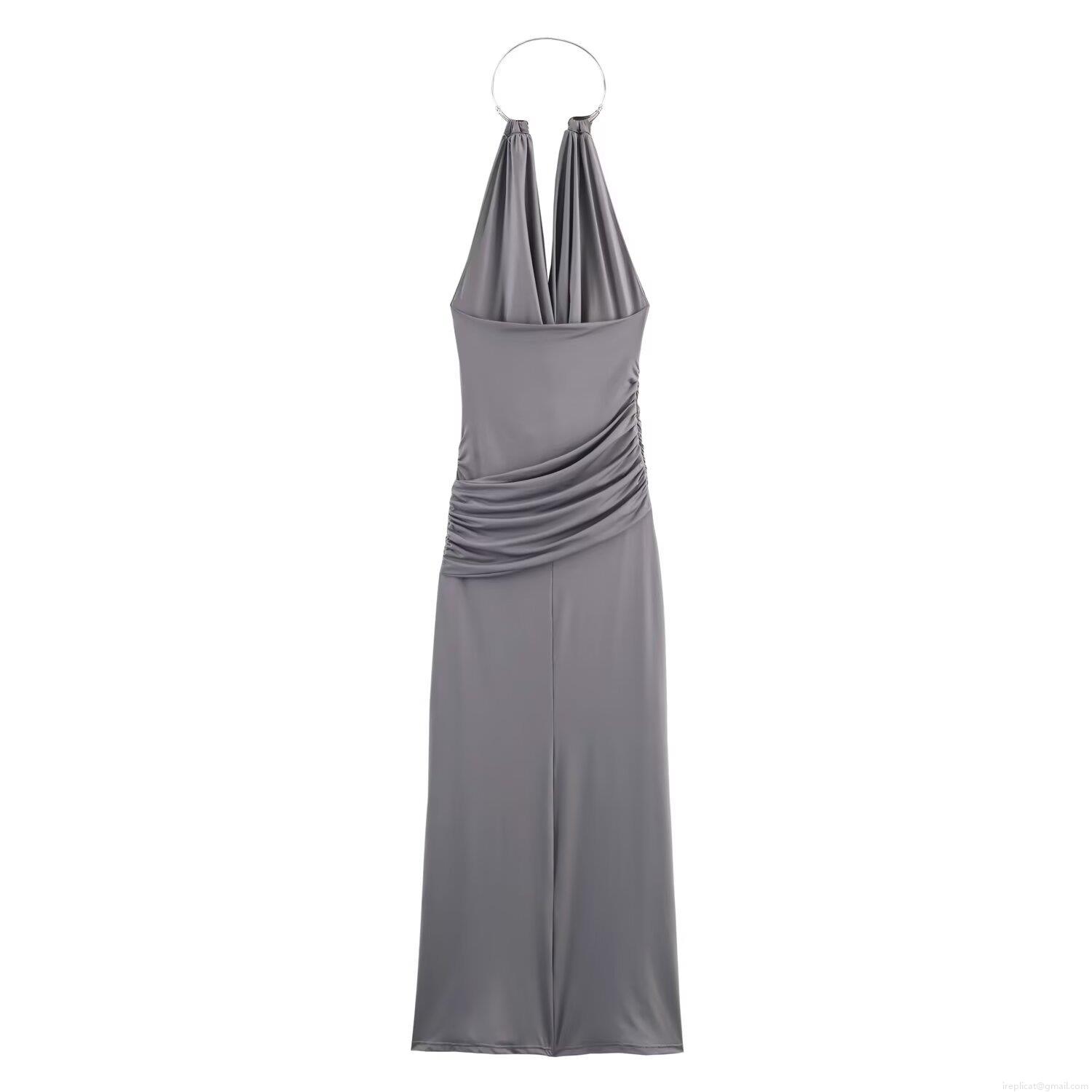 • Women Sexy Halter Neck Maxi Dress Satin Silk Drape Neck Ruched Evening Party Wedding Cocktail Dress With Metal Ring Silver Grey