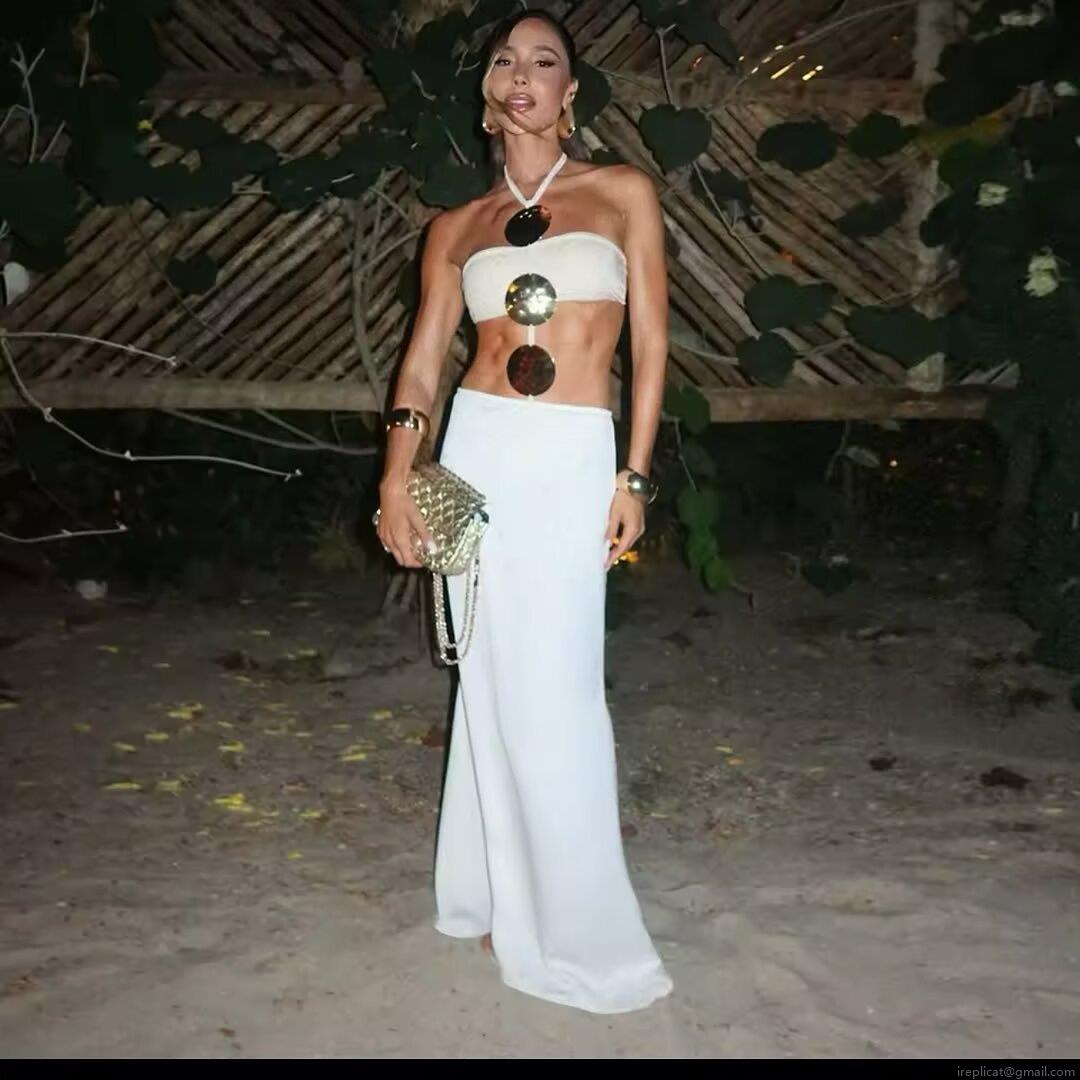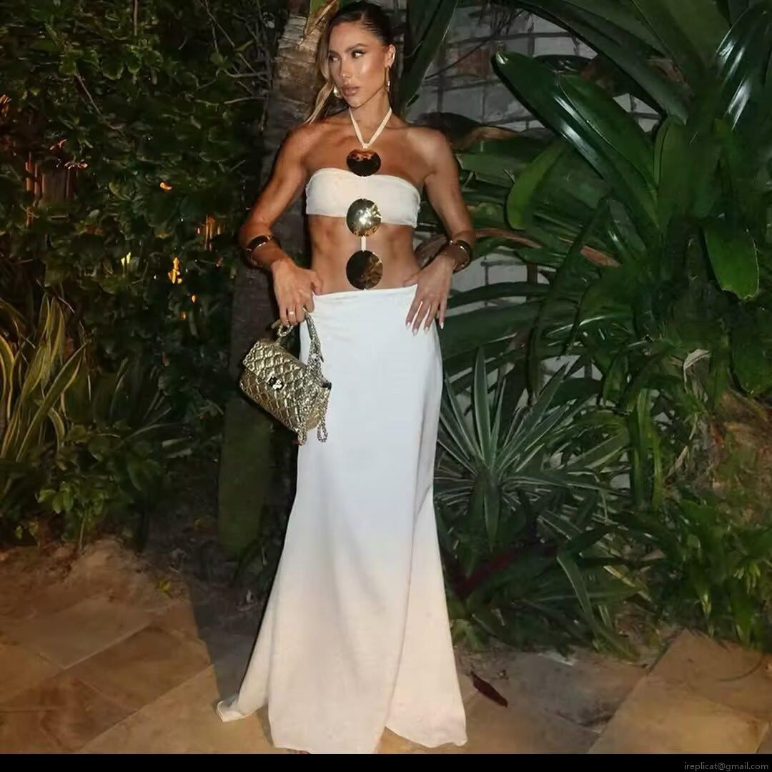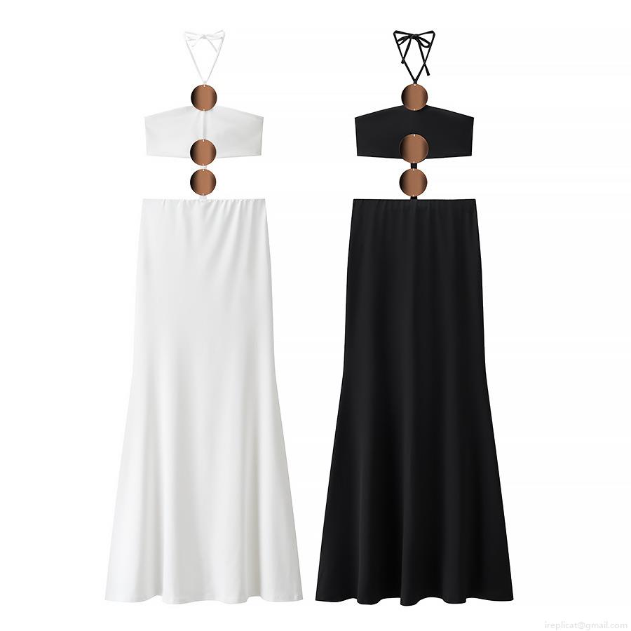 • Women Sexy Halter Neck Maxi Dress Waist Cut Out With Gold Metal Rings Solid Color Polyester Beach Vacation Party Elegant Long Dress