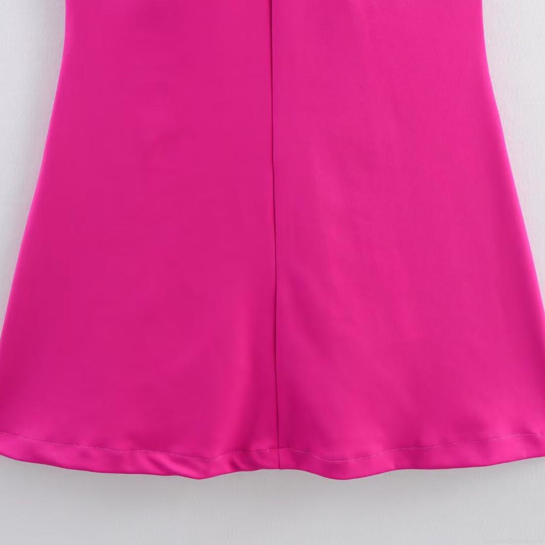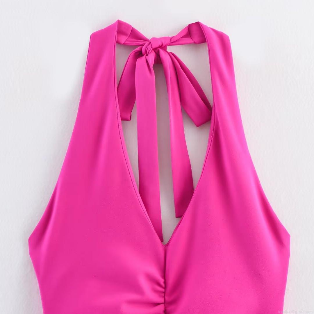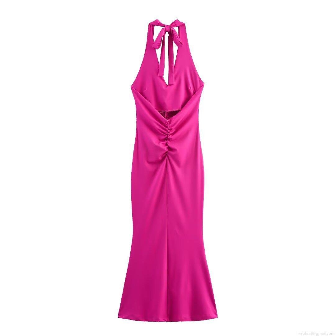 • Women Sexy Halter Ruched Rose Red Satin Maxi Dress Backless Mermaid Evening Party Bodycon Dress With Bow Tie Summer Sleeveless Solid Color Elegant Club Outfit