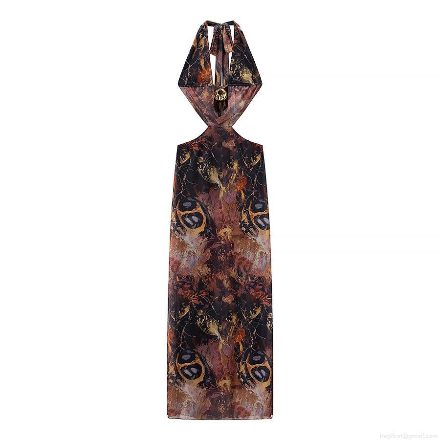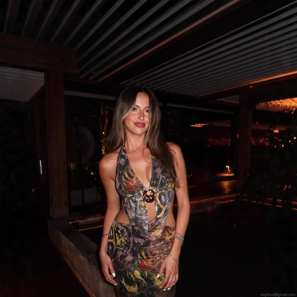 Women Sexy Halter V Neck Maxi Dress Mesh Polyester Metal Ring Cutout Backless Abstract Print Slim Fit Long Sundress For Party Vacation