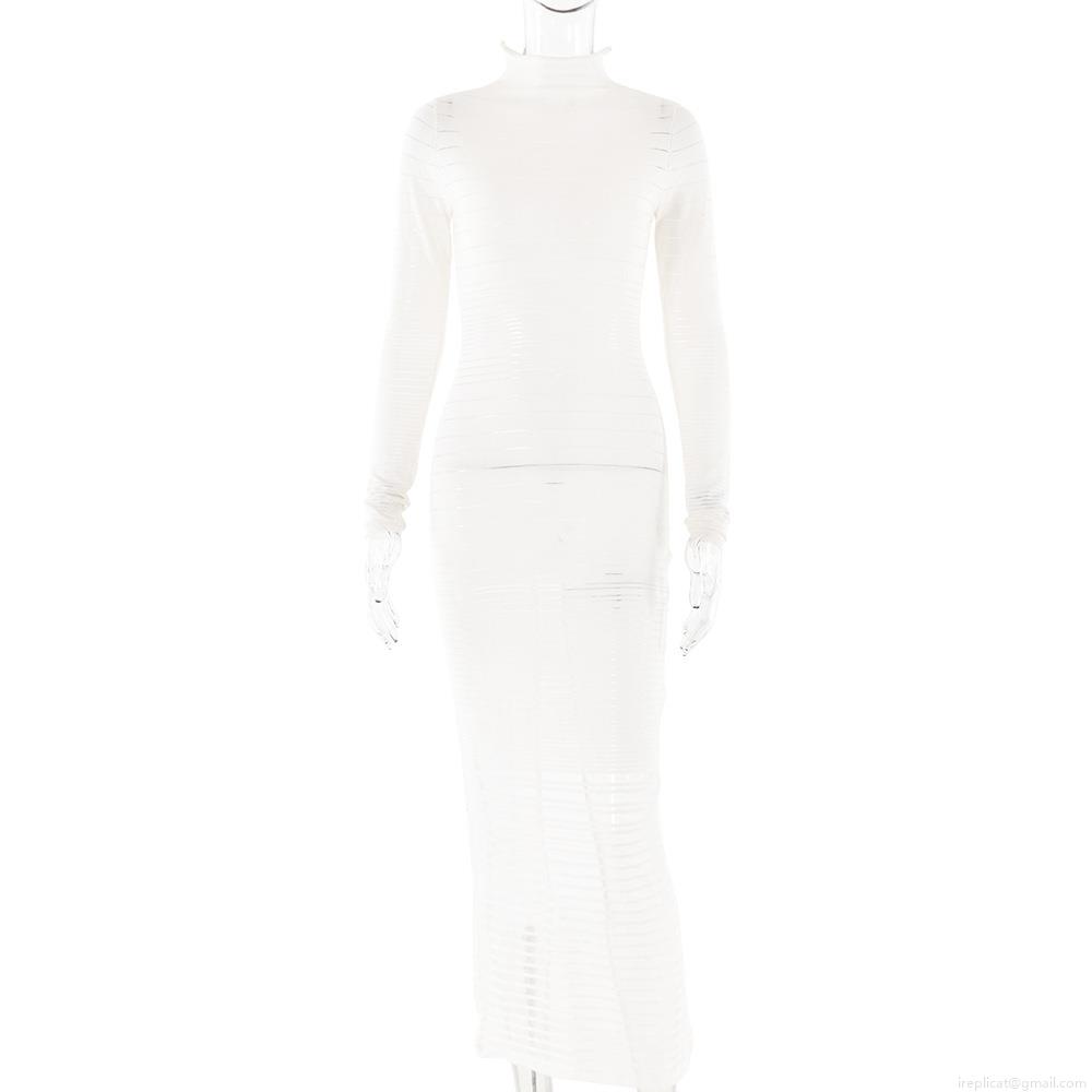 • Women Sexy High Neck Long Sleeve Bodycon Maxi Dress Sheer Striped Knitted See-Through Ribbed Pencil Dress For Club Party Night Out Streetwear