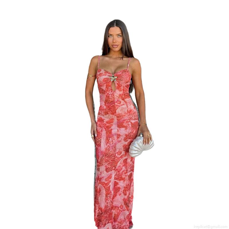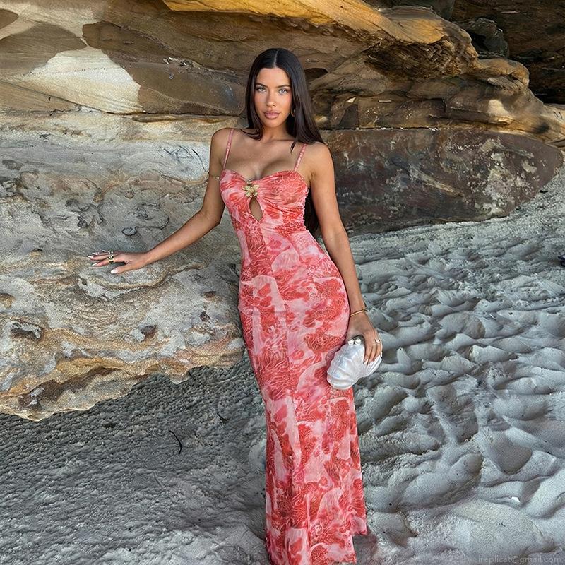 • Women Sexy Hollow Out Camisole Maxi Dress Floral Print Milk Silk Slim Fit Sleeveless Long Dress With Metal Flower For Summer Beach Vacation Party